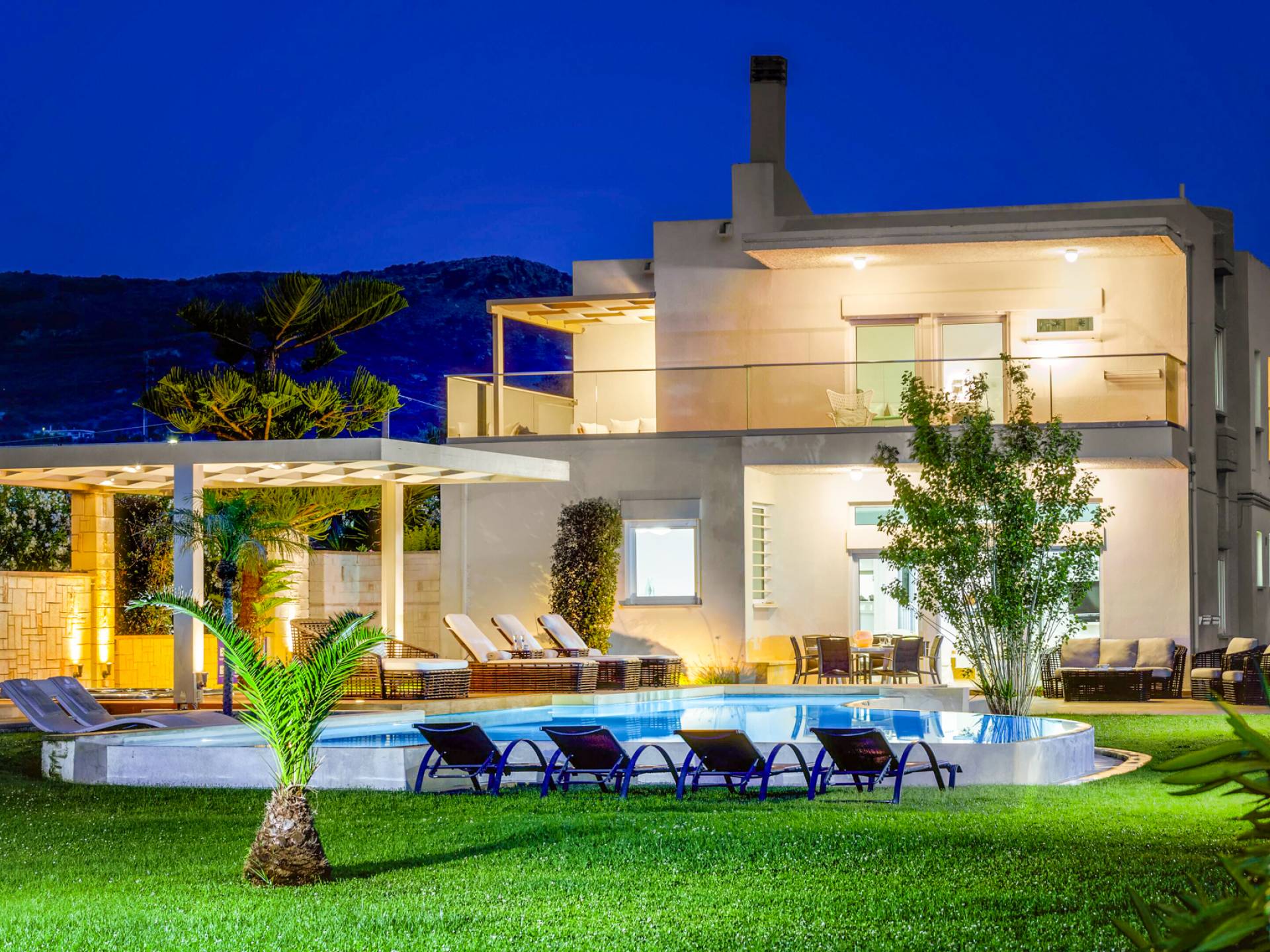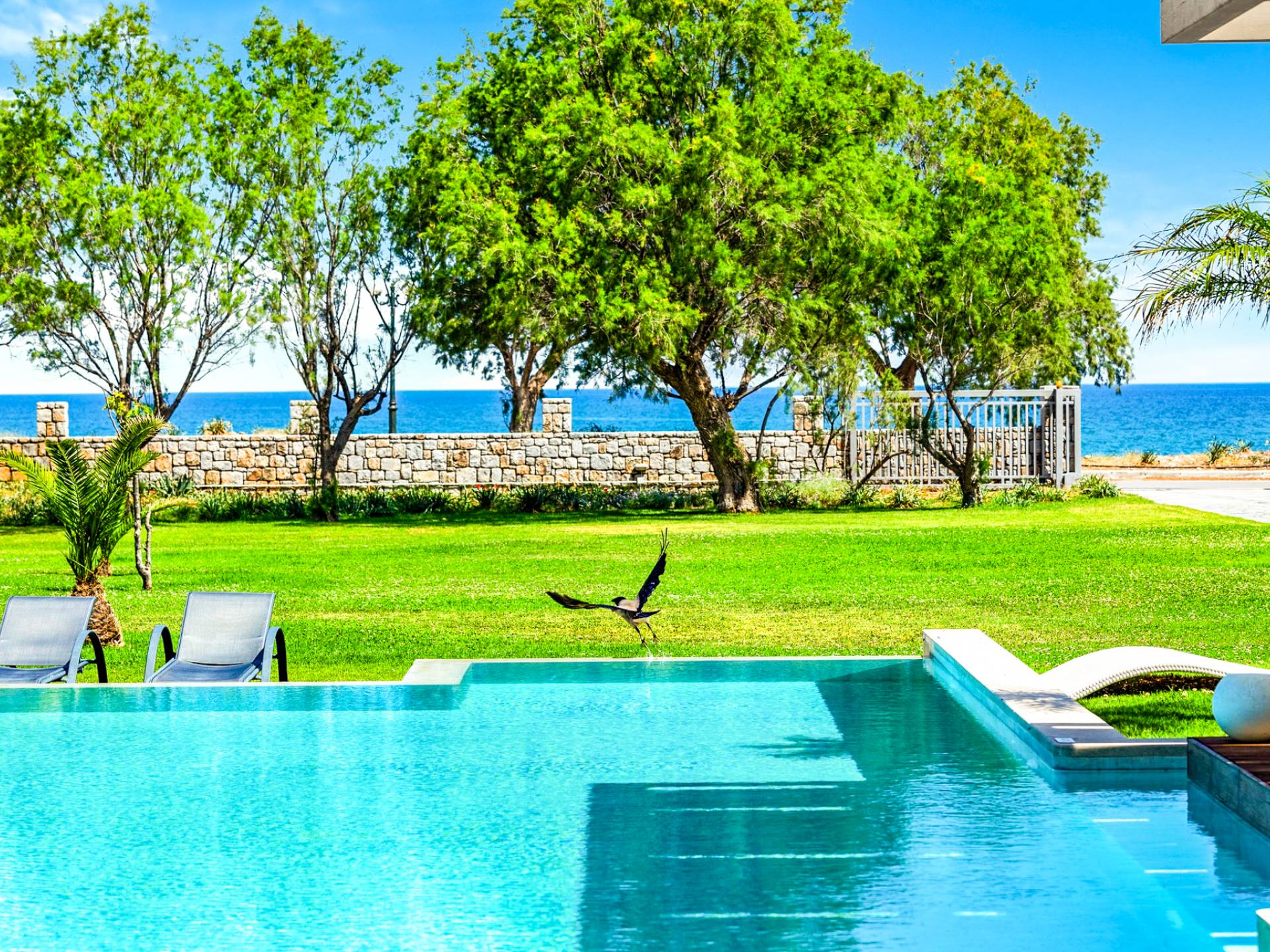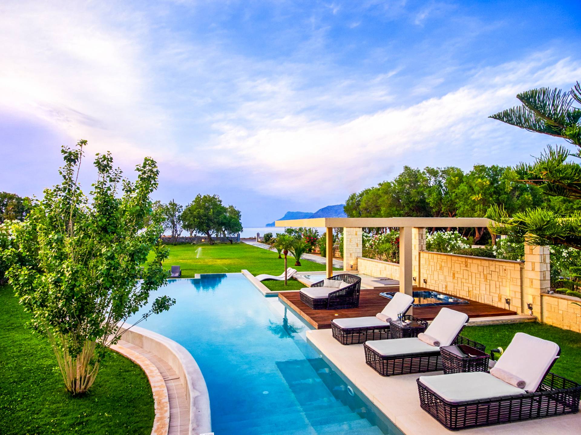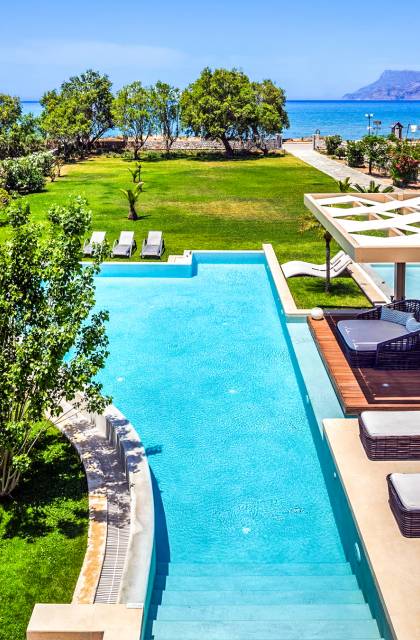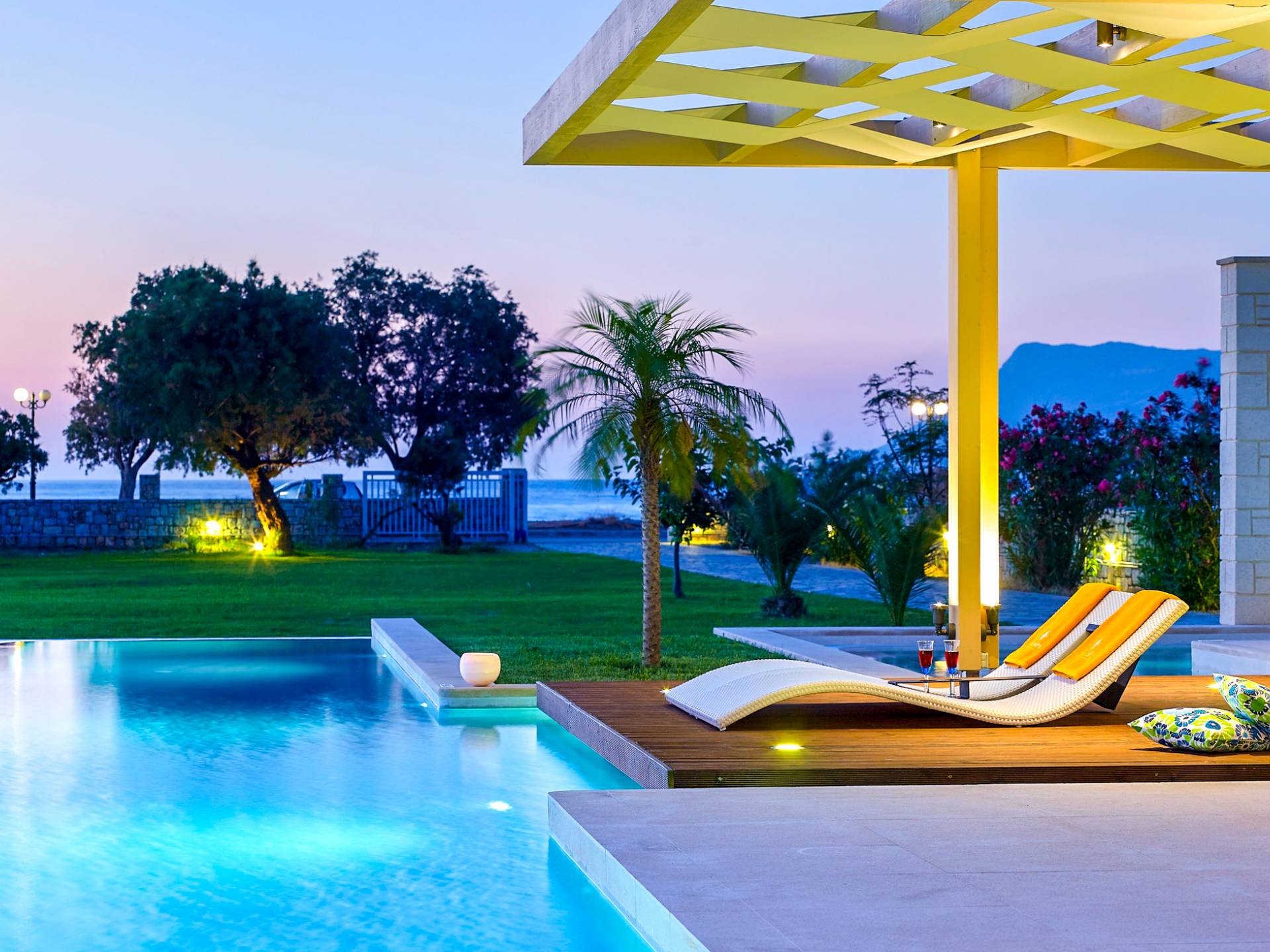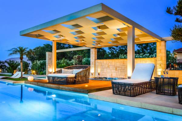 Die Elvina Villa Beachfront Chania ist für eine Gruppe von Freunden oder eine Familie geeignet. Es besteht aus 2 Etagen und umfasst hauptsächlich Open-Air-Bereiche, so dass Sie die frische Luft und die Meeresbrise spüren können, die überall vorherrscht. Die Pastellfarben, die dezente Dekoration des Interieurs sowie die modern und elegant eingerichteten Zimmer ergänzen das allgemeine Entspannungsgefühl. Elvina Villa Chania ermöglicht es Ihnen, entweder im 80 m2 großen Pool (12 m2 für Ihre Kinder) oder im Meer zu schwimmen und sich beim Blick auf den herrlichen Sonnenuntergang zu entspannen. Sie können Ihr Abendessen auch unter der Weinlaube eines Steingrills mit Meerblick genießen oder jederzeit einen Spaziergang durch den gepflegten Garten genießen.