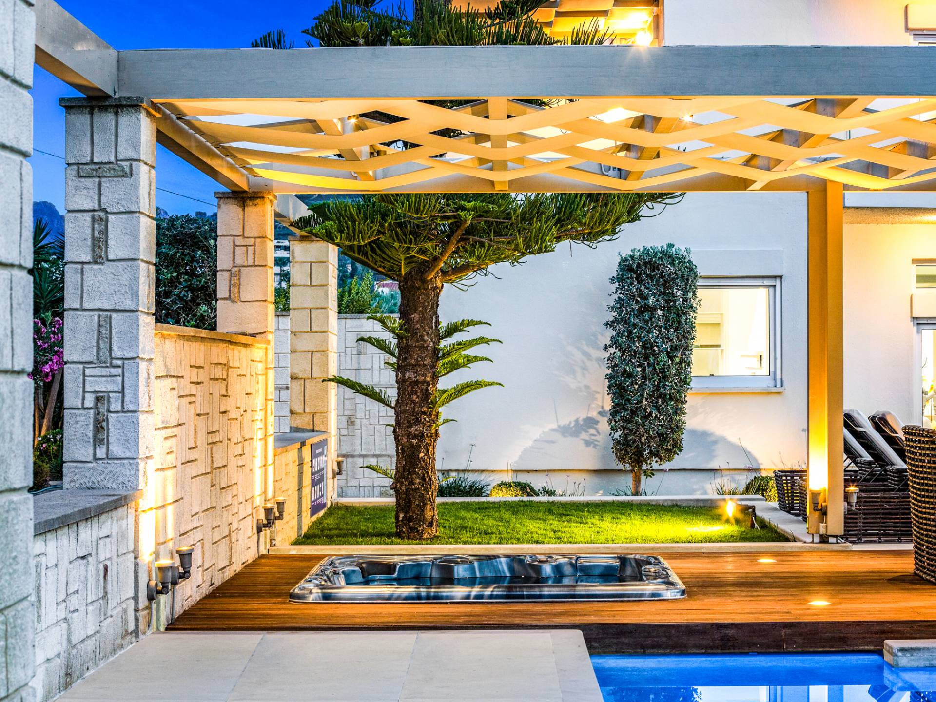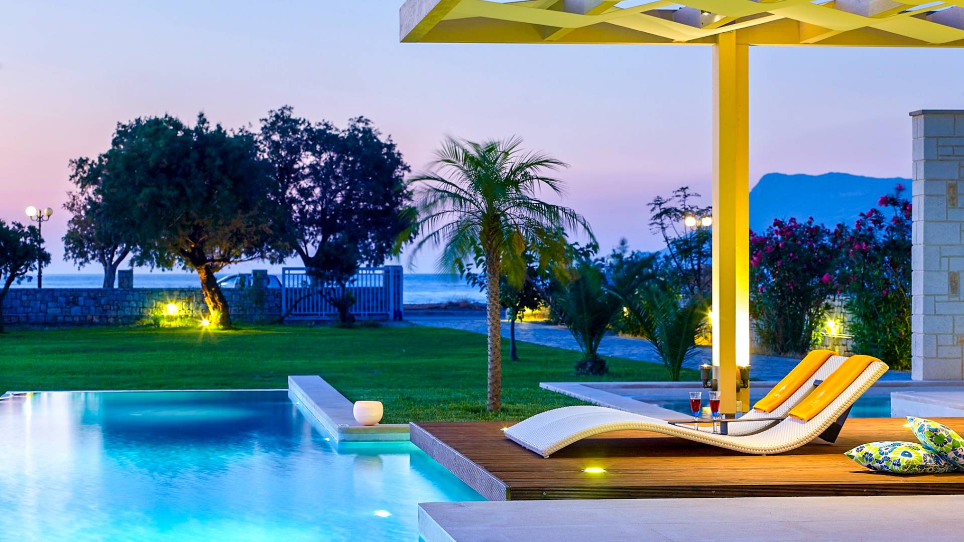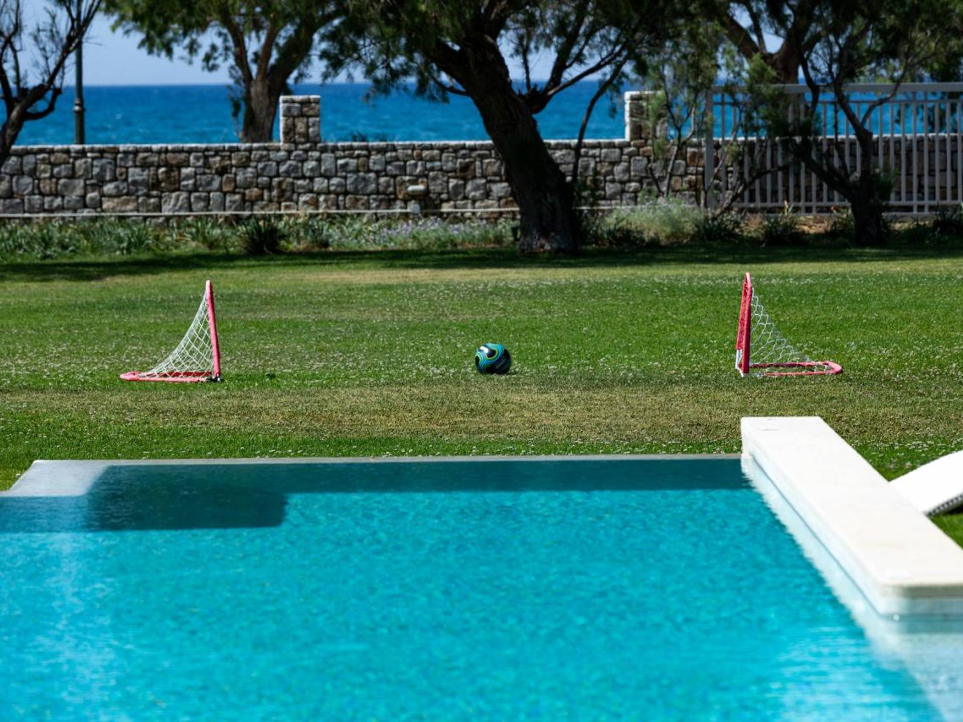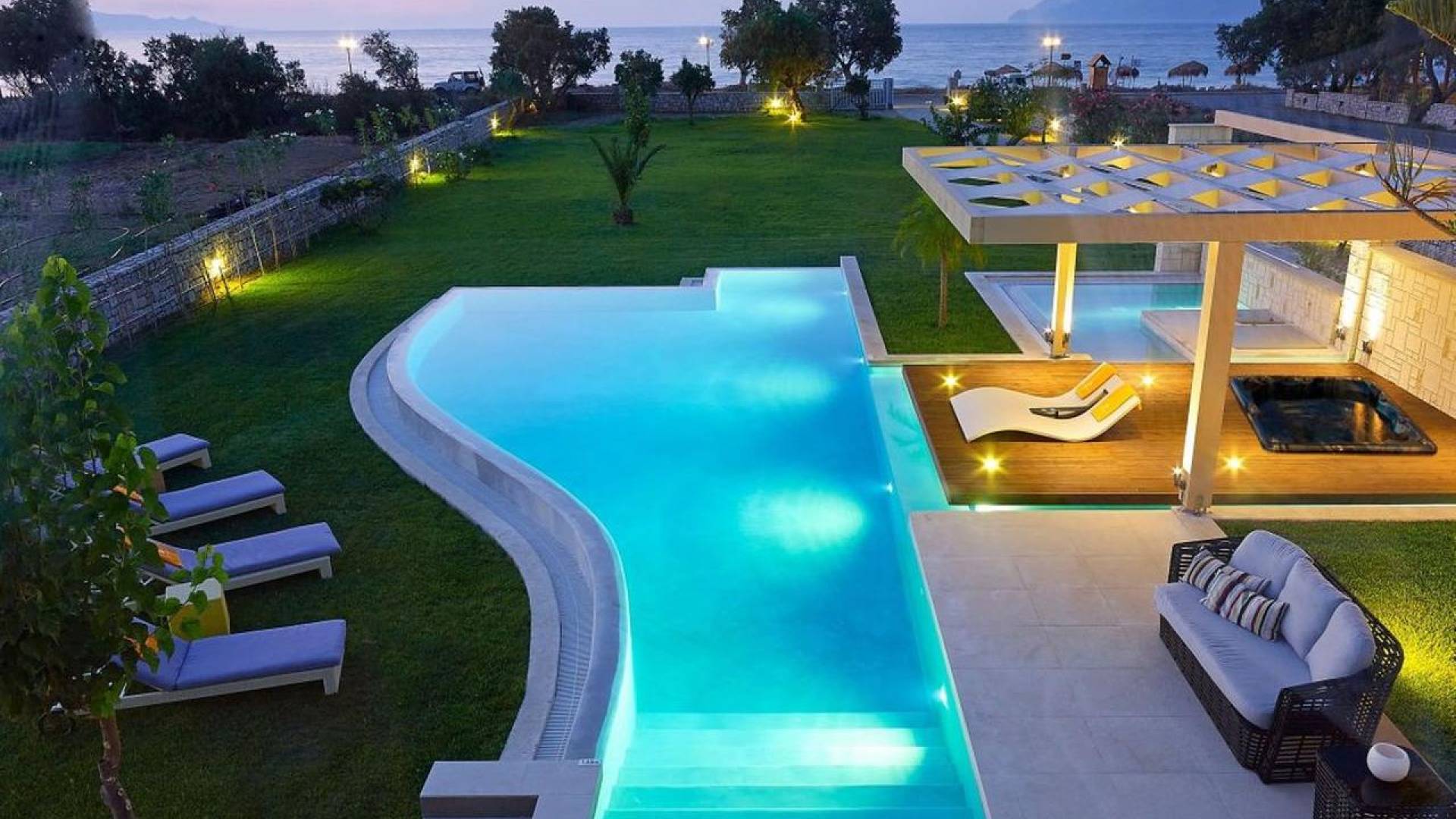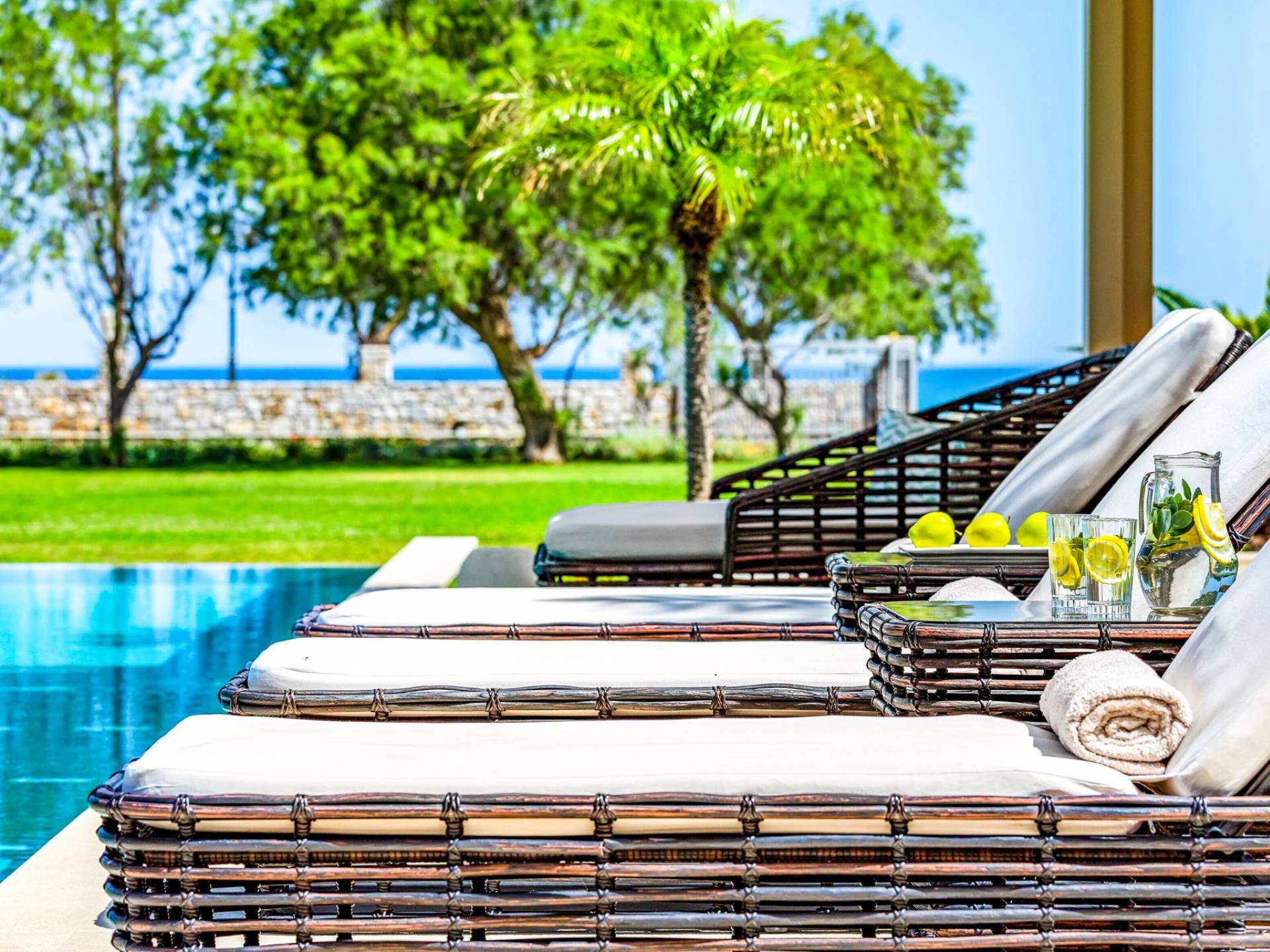 Die Elvina Villa Beachfront Chania ist für eine Gruppe von Freunden oder eine Familie geeignet. Es besteht aus 2 Etagen und umfasst hauptsächlich Open-Air-Bereiche, so dass Sie die frische Luft und die Meeresbrise spüren können, die überall vorherrscht. Die Pastellfarben, die dezente Dekoration des Interieurs sowie die modern und elegant eingerichteten Zimmer ergänzen das allgemeine Entspannungsgefühl. Elvina Villa Chania ermöglicht es Ihnen, entweder im 80 m2 großen Pool (12 m2 für Ihre Kinder) oder im Meer zu schwimmen und sich beim Blick auf den herrlichen Sonnenuntergang zu entspannen. Sie können Ihr Abendessen auch unter der Weinlaube eines Steingrills mit Meerblick genießen oder jederzeit einen Spaziergang durch den gepflegten Garten genießen.
