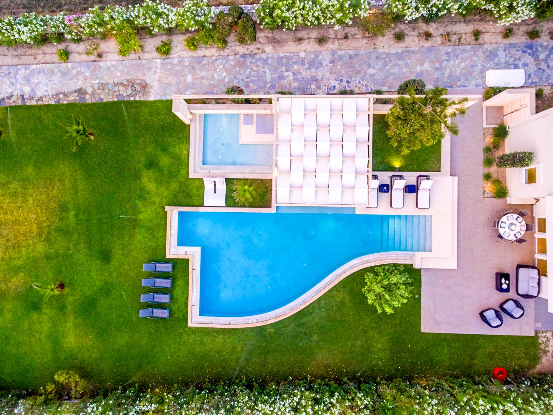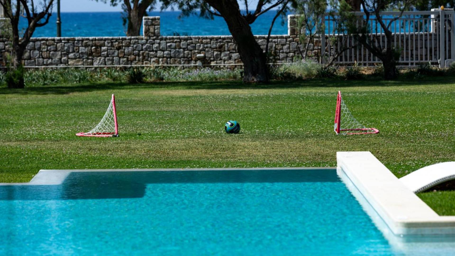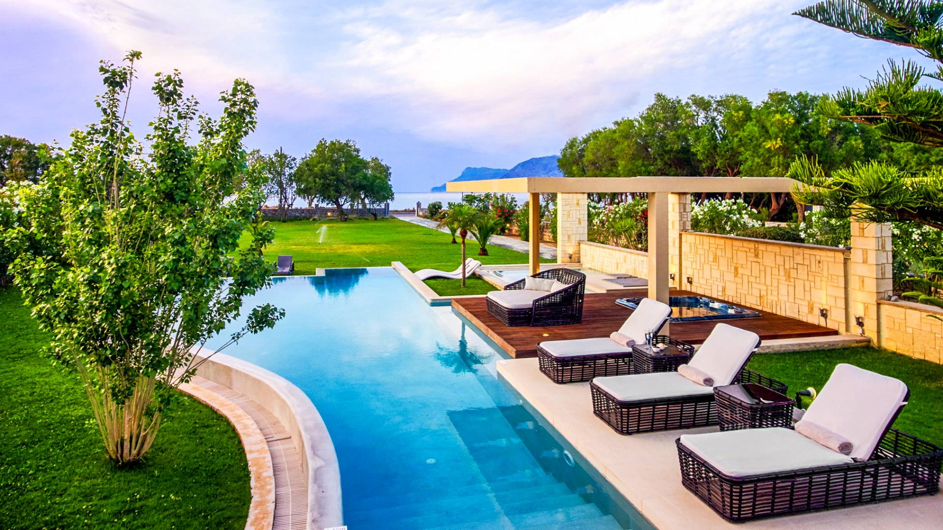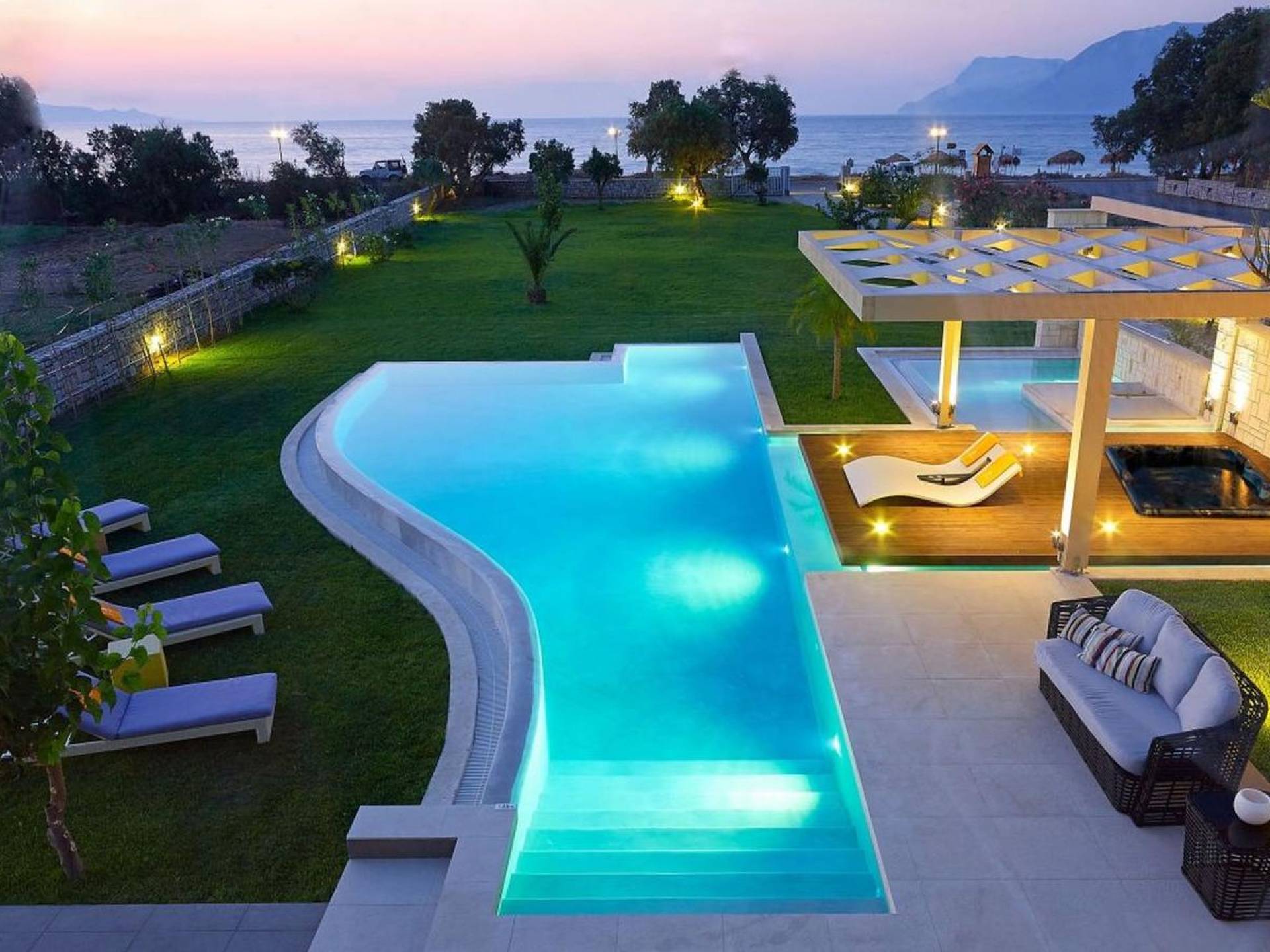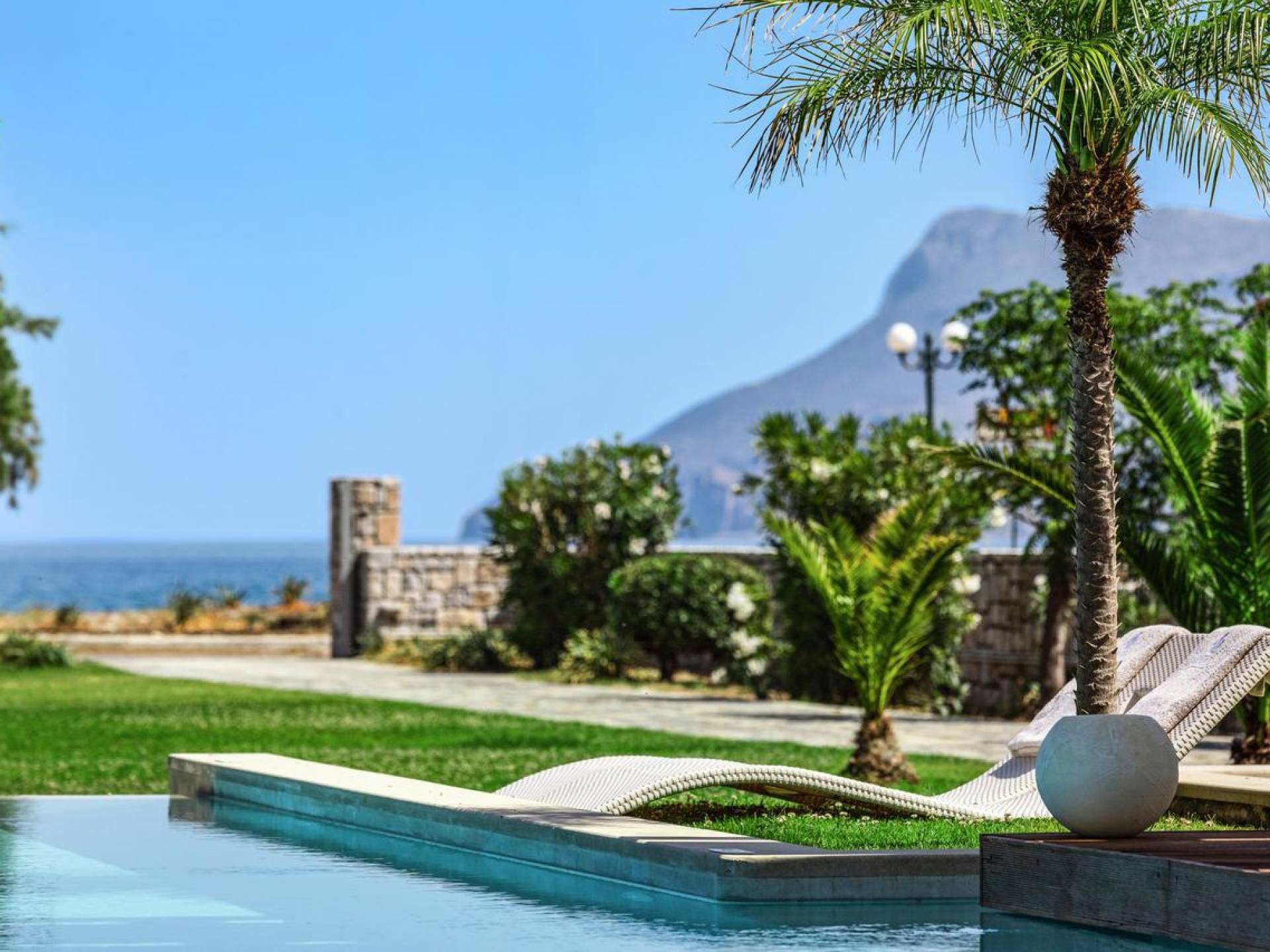 Die Elvina Villa Beachfront Chania ist für eine Gruppe von Freunden oder eine Familie geeignet. Es besteht aus 2 Etagen und umfasst hauptsächlich Open-Air-Bereiche, so dass Sie die frische Luft und die Meeresbrise spüren können, die überall vorherrscht. Die Pastellfarben, die dezente Dekoration des Interieurs sowie die modern und elegant eingerichteten Zimmer ergänzen das allgemeine Entspannungsgefühl. Elvina Villa Chania ermöglicht es Ihnen, entweder im 80 m2 großen Pool (12 m2 für Ihre Kinder) oder im Meer zu schwimmen und sich beim Blick auf den herrlichen Sonnenuntergang zu entspannen. Sie können Ihr Abendessen auch unter der Weinlaube eines Steingrills mit Meerblick genießen oder jederzeit einen Spaziergang durch den gepflegten Garten genießen.