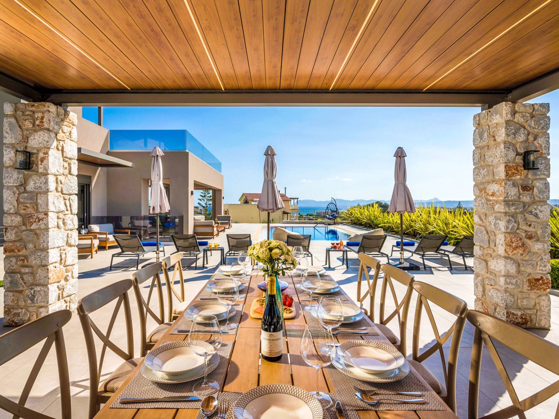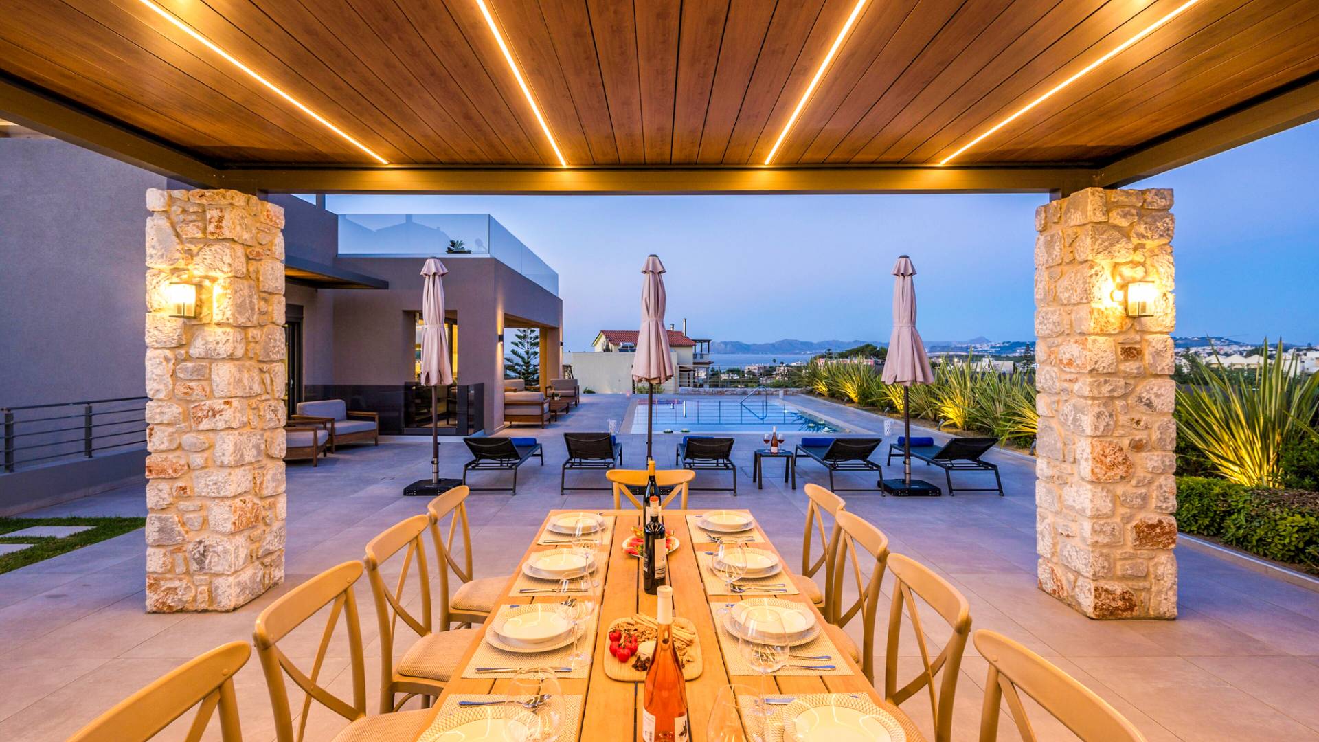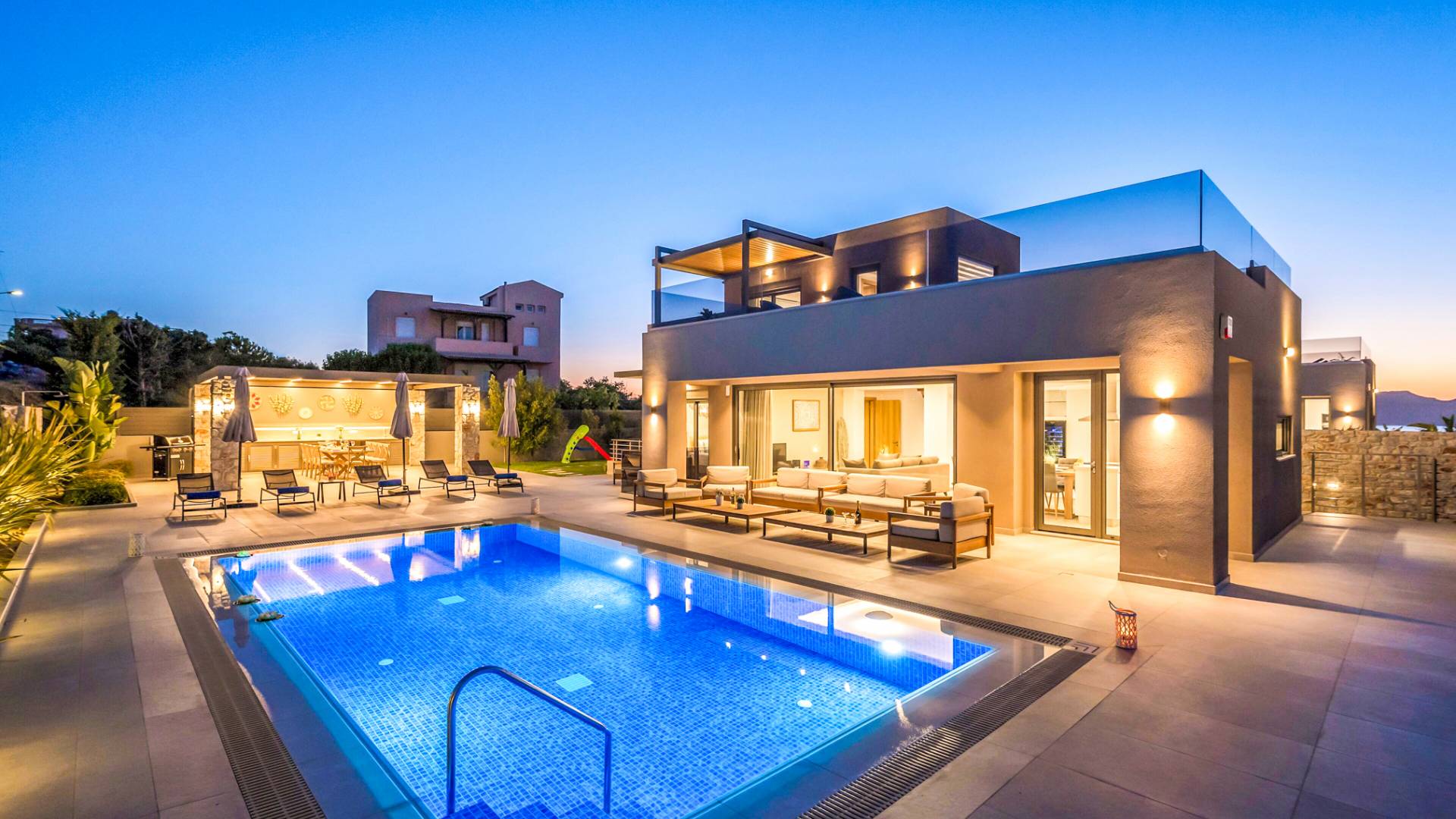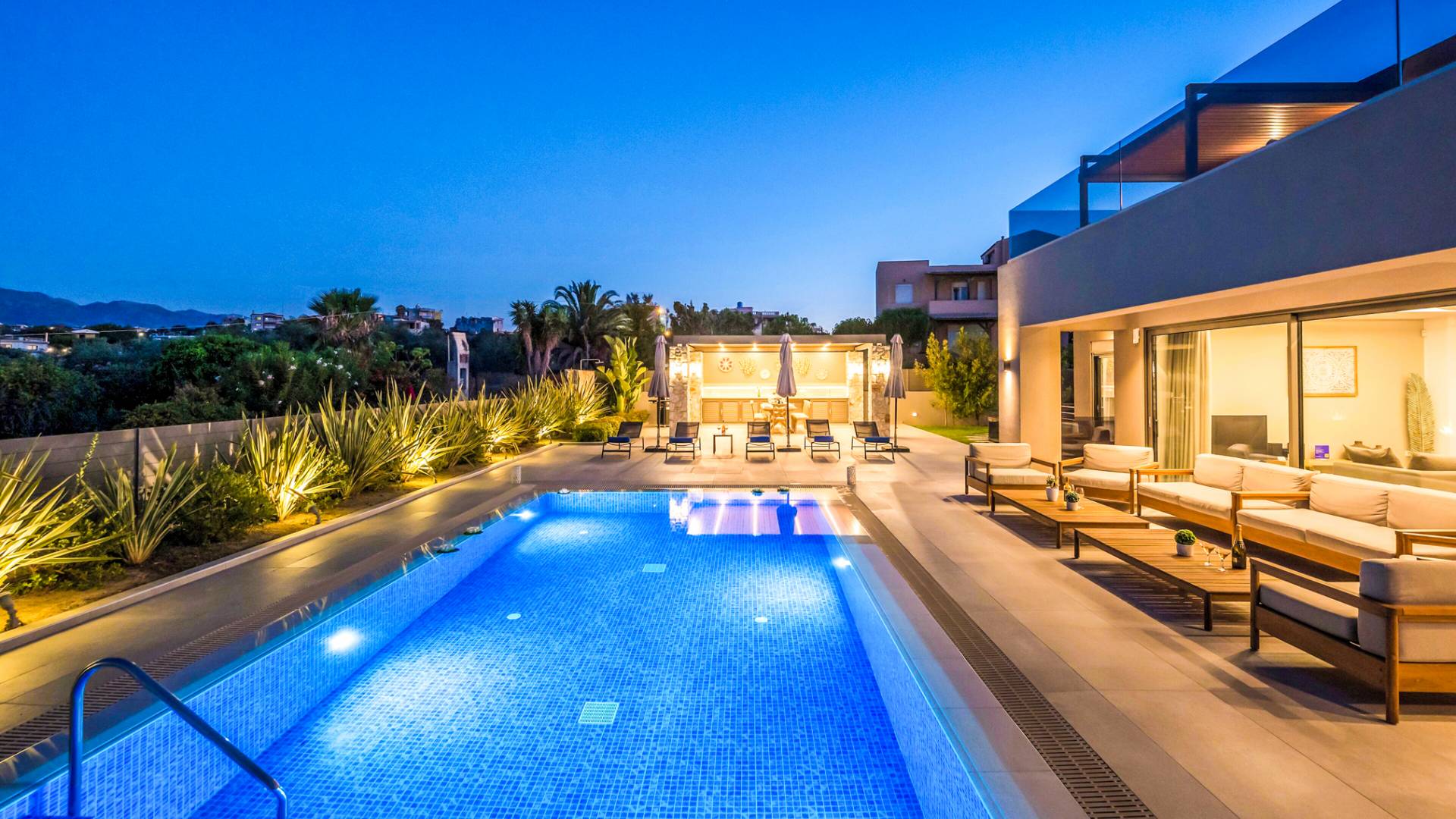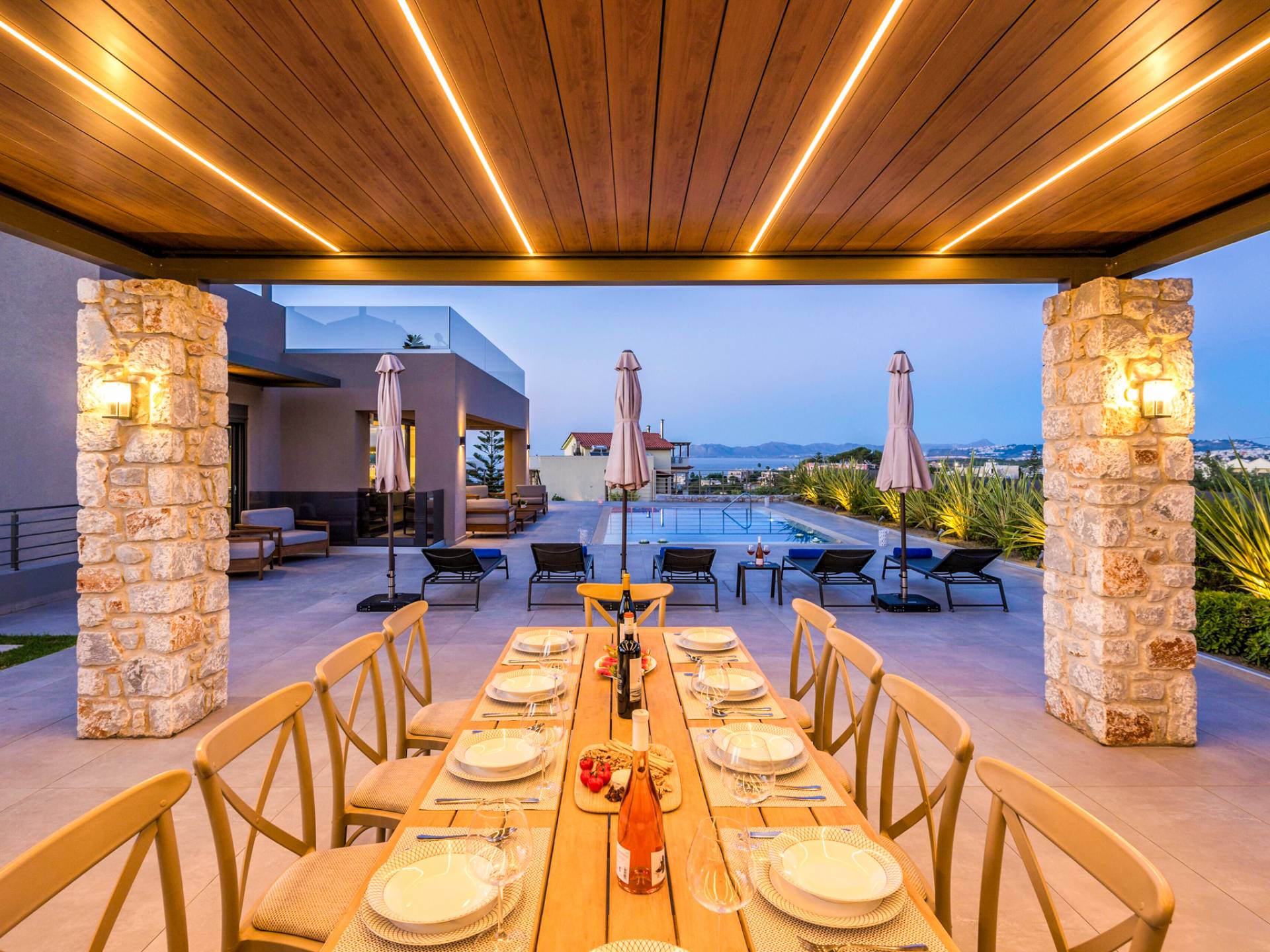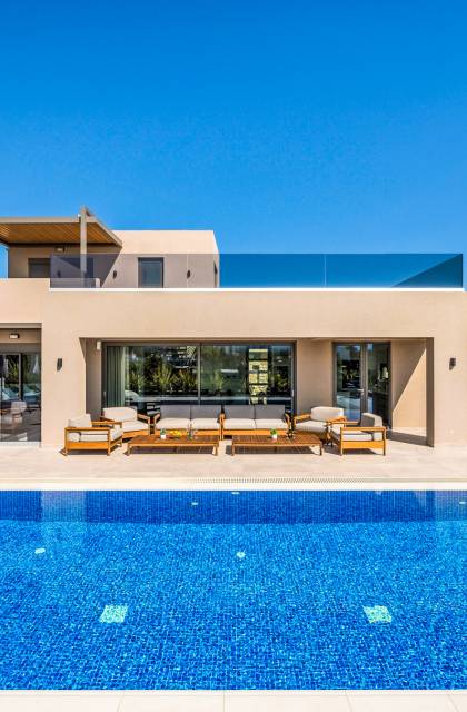 Designed for larger groups and families, the villa delivers state-of-the-art amenities, 5-star facilities, and generous indoor-outdoor spaces — creating the ideal setting for comfort, relaxation, and unforgettable shared moments in Crete.