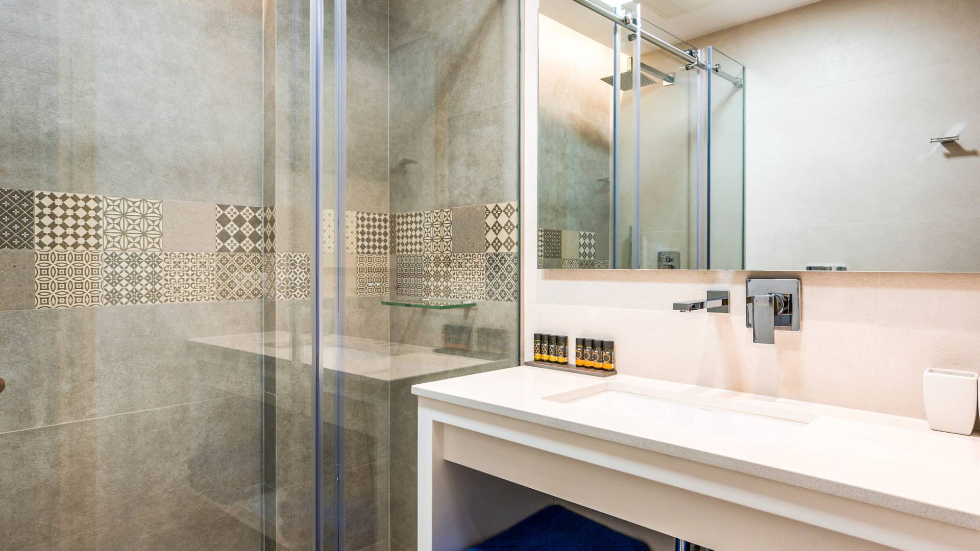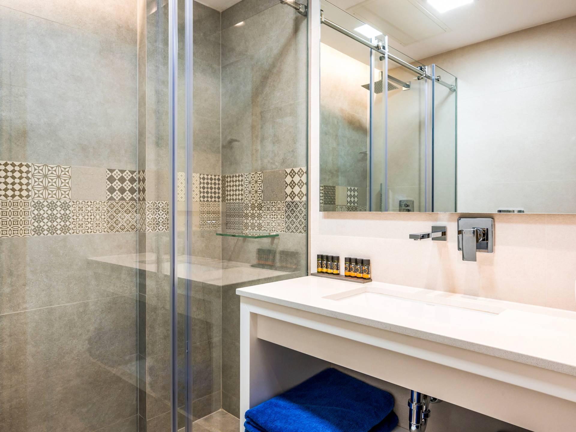 - Modern bathroom with walk in shower