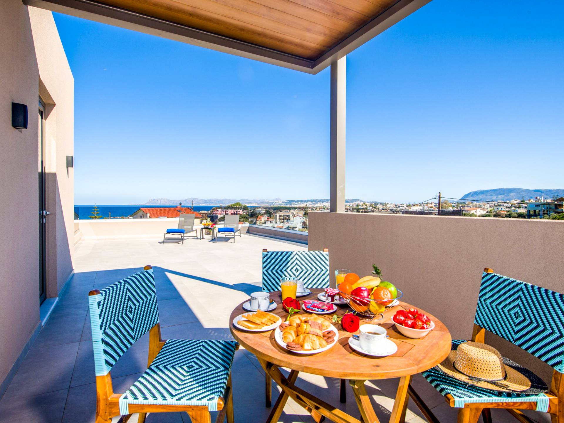 - Large roof terrace with sun loungers and dining table