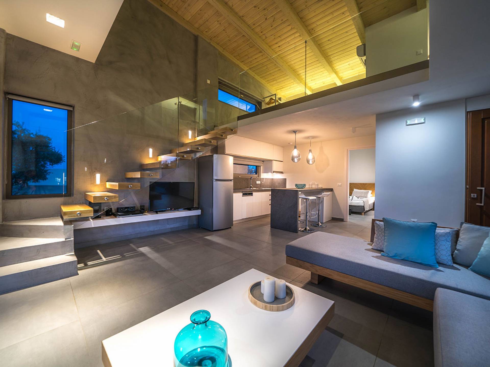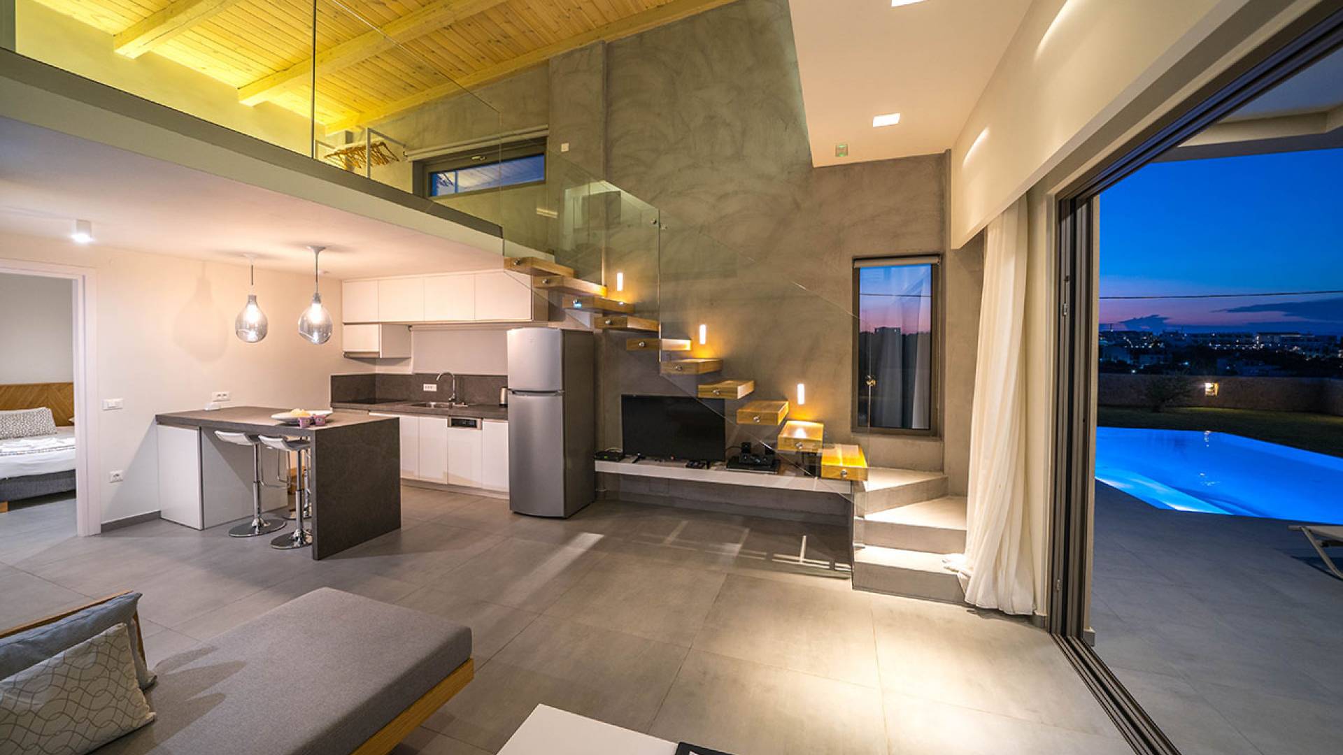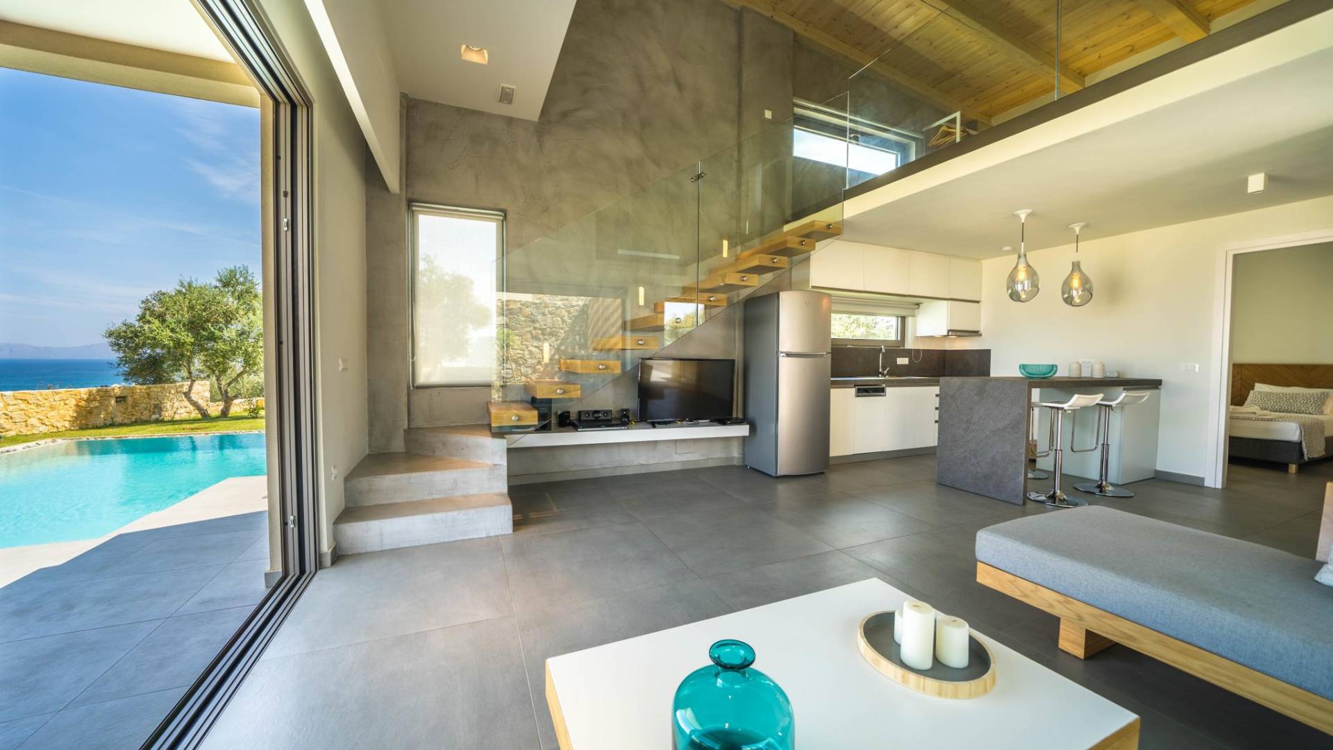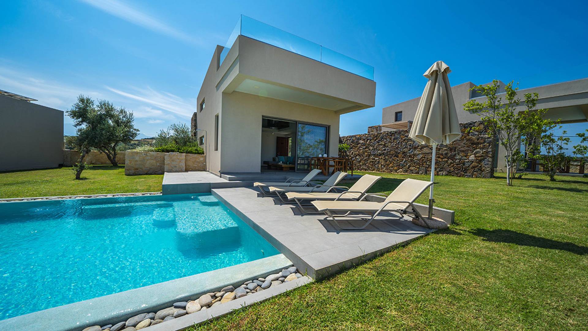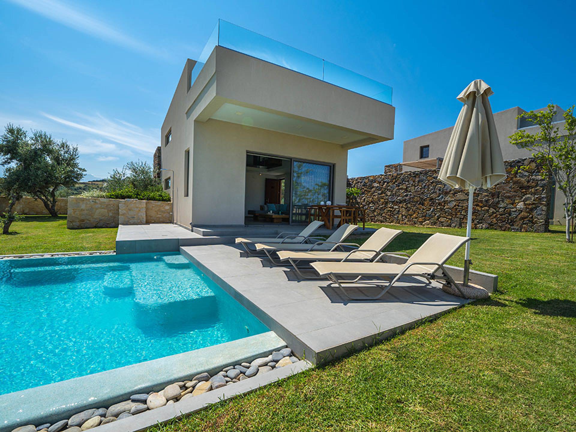 Cada villa consta de dos dormitorios, dos baños, una piscina privada y puede acomodar hasta 10 personas en total. Un plano de planta moderno y abierto une el interior de las Villas con la impresionante vista exterior y el amplio jardín con la piscina. Cada villa tiene dos camas dobles con la mejor calidad disponible de colchones anatómicos de CocoMat, líder en colchones de primera calidad. Habiendo equipado las Villas con todo lo que uno podría pedir, como una cocina totalmente equipada con una lavadora, Iskios Estate Chania lo hará sentir inmediatamente como en casa, incluso cuando esté de vacaciones. Experimentar algo único no significa que tengas que sacrificar nada.