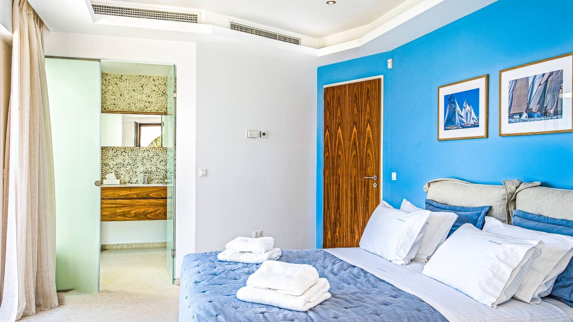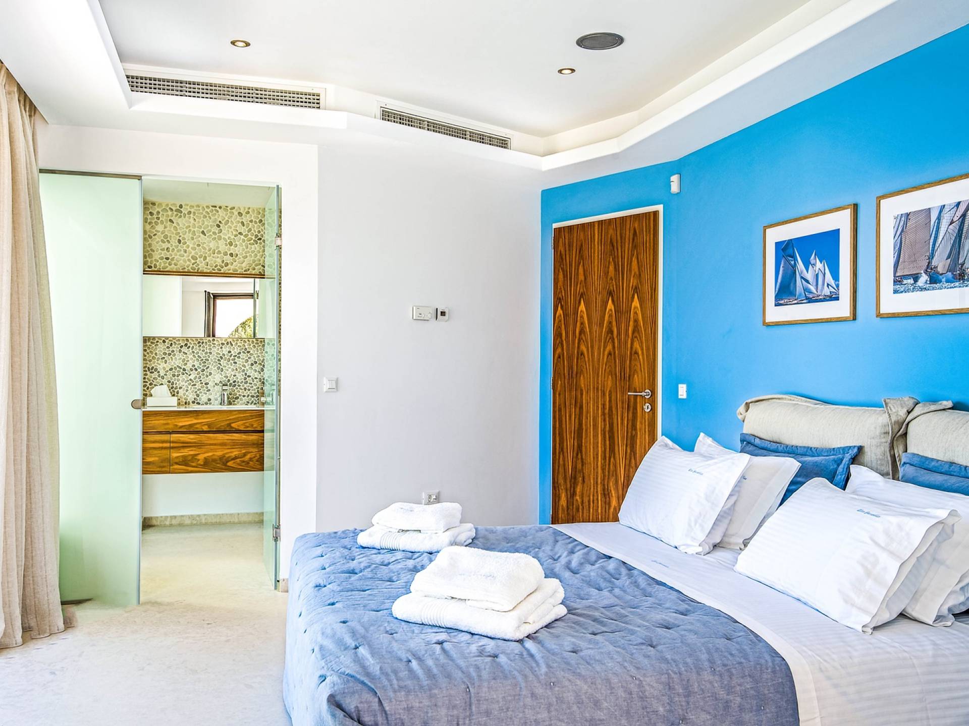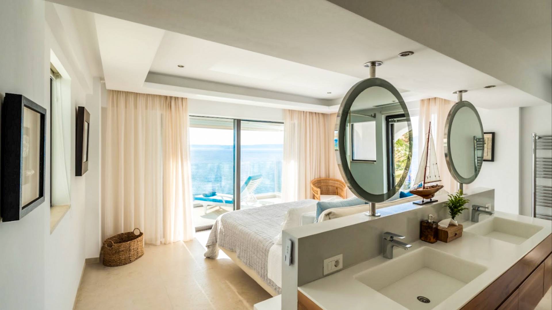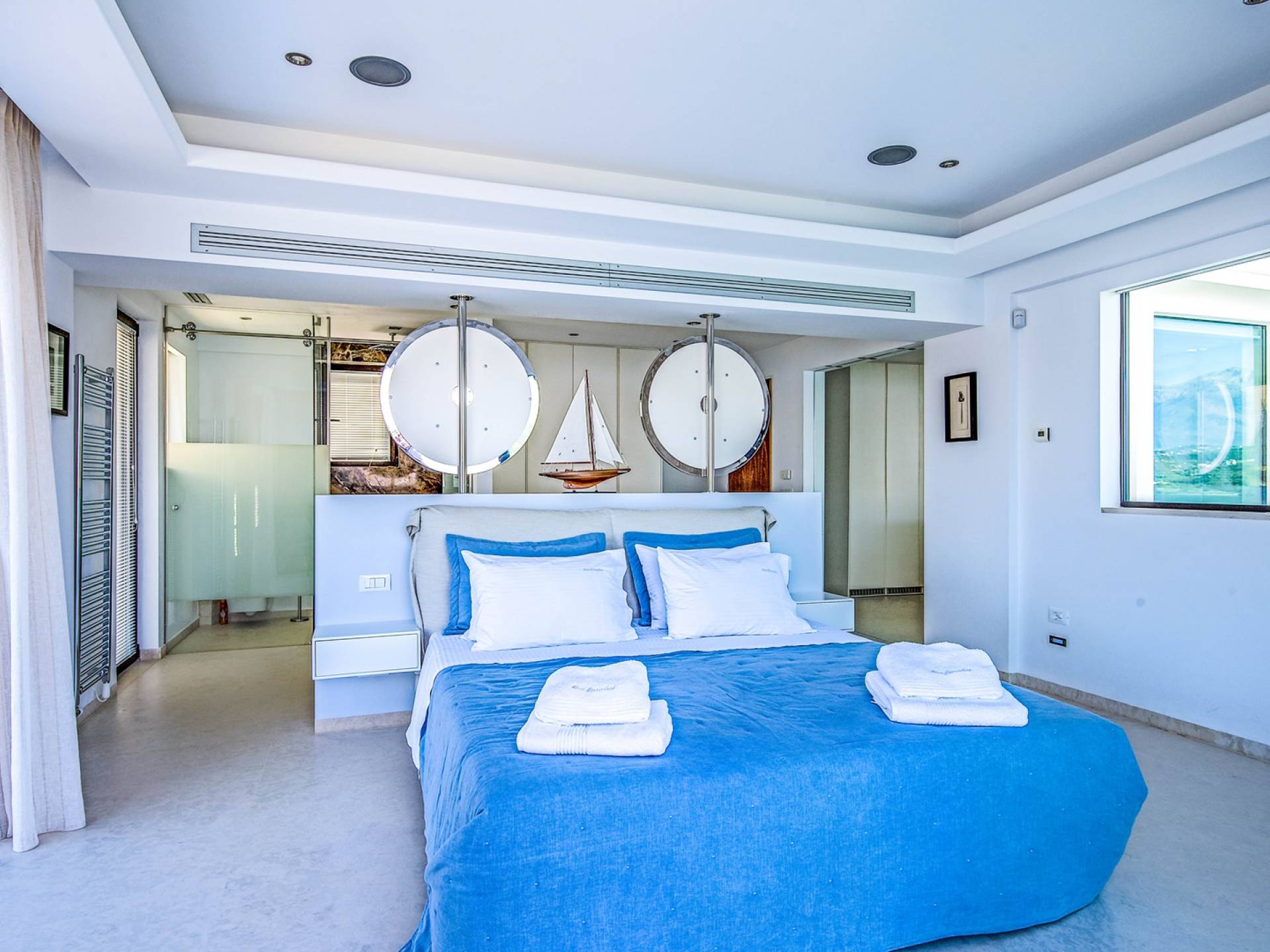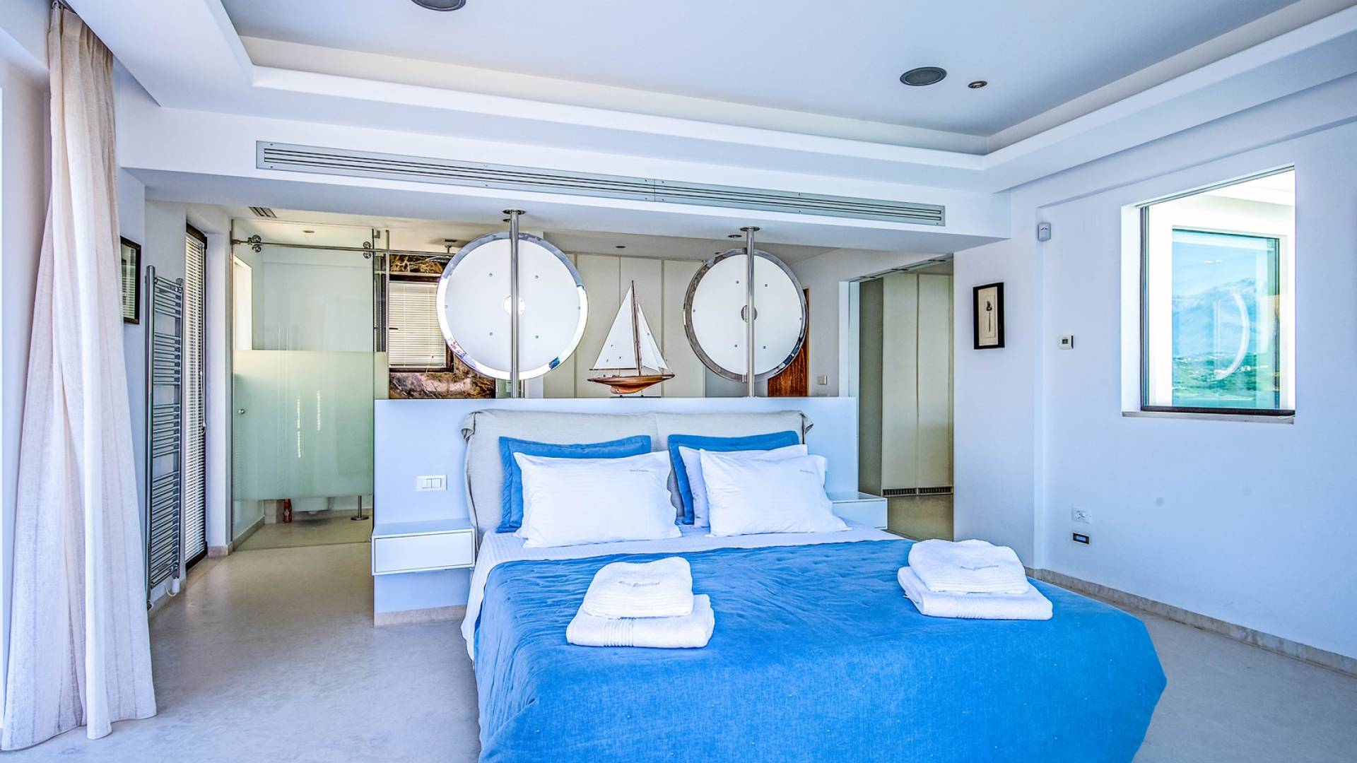 Al piano terra della villa principale si trovano la master suite con letto king-size, doccia all'aperto, vista mare e terrazza coperta di fronte alla piscina riscaldata a sfioro di acqua salata. Al secondo piano con ascensore e scale si trova una seconda master suite con letto king-size, vista mare e accesso al giardino. La terza camera ha due letti singoli convertibili in un letto king-size, una terrazza coperta con vista mare con divano letto e attrezzi ginnici.