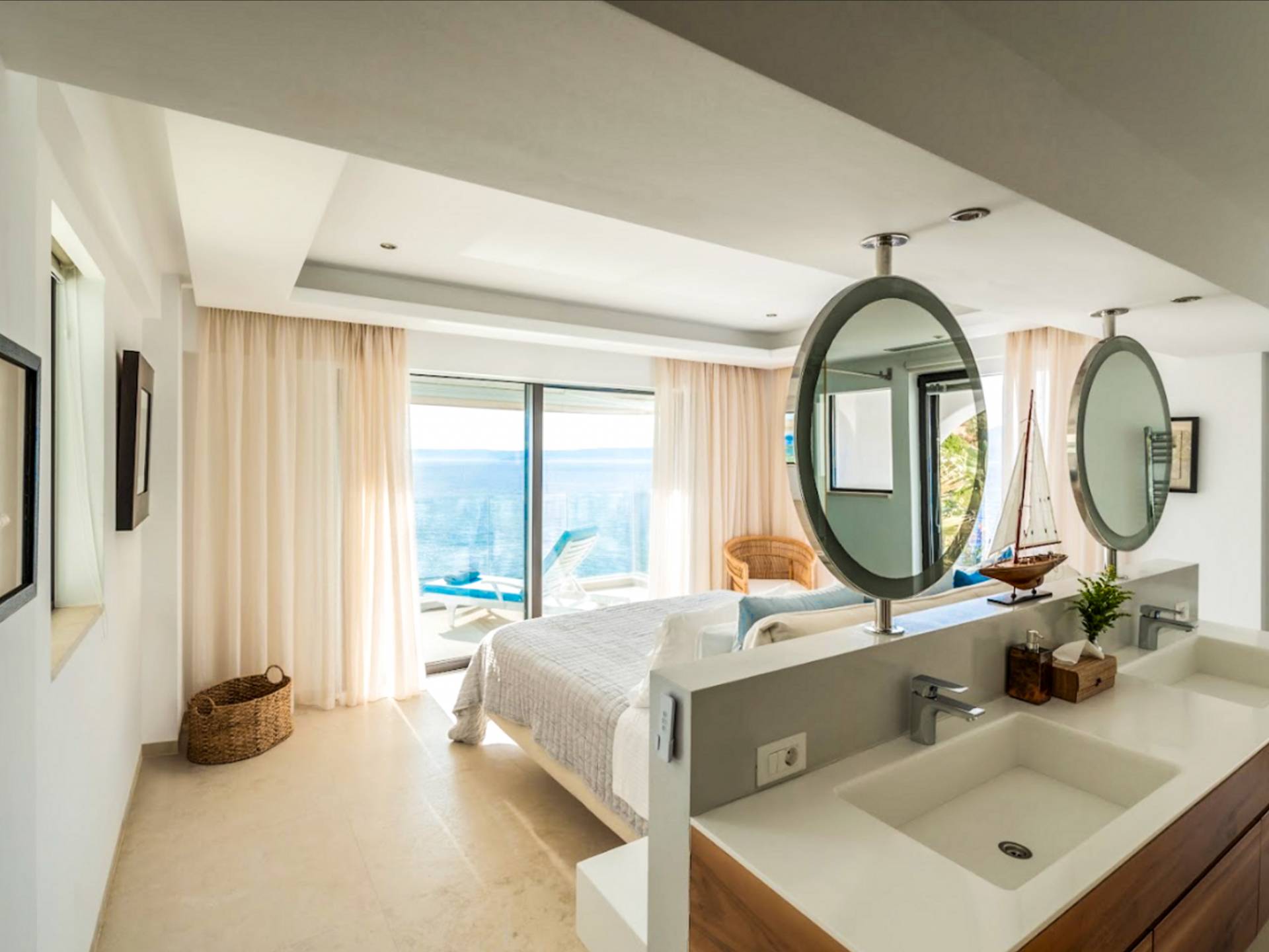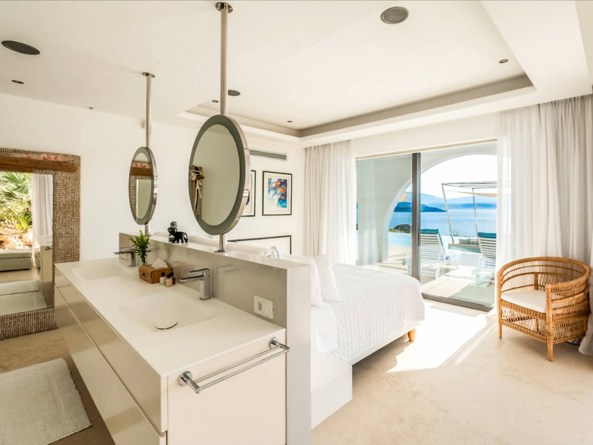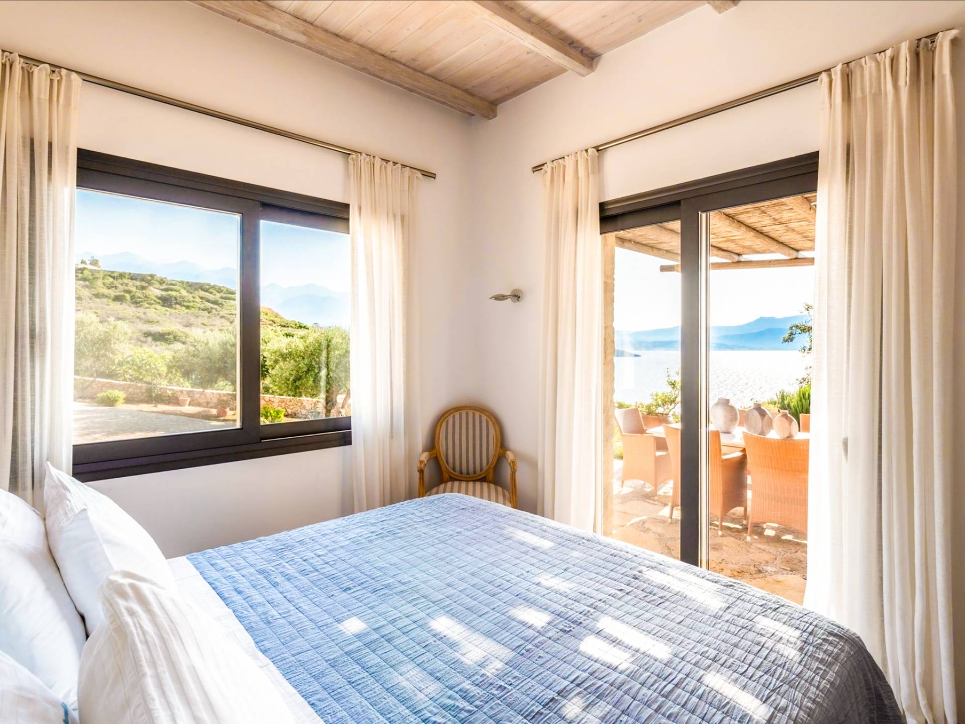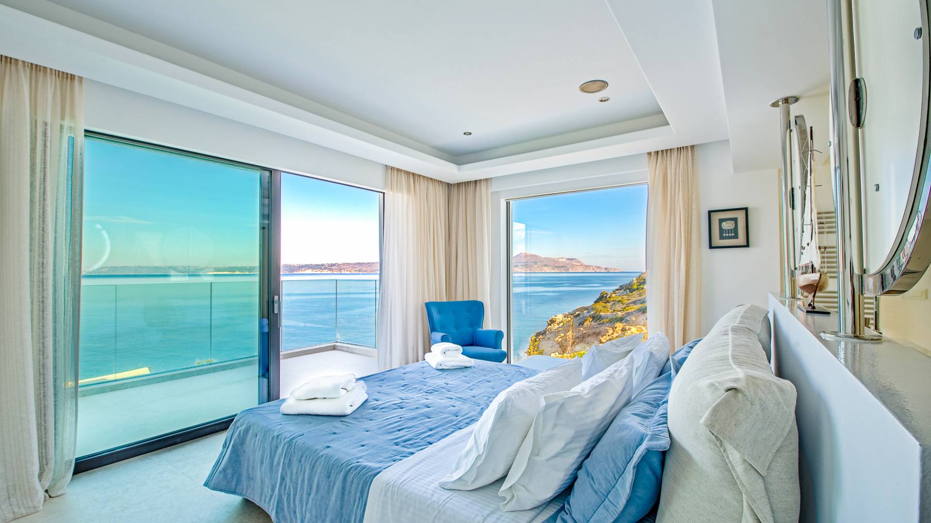 Al piano terra della villa principale si trovano la master suite con letto king-size, doccia all'aperto, vista mare e terrazza coperta di fronte alla piscina riscaldata a sfioro di acqua salata. Al secondo piano con ascensore e scale si trova una seconda master suite con letto king-size, vista mare e accesso al giardino. La terza camera ha due letti singoli convertibili in un letto king-size, una terrazza coperta con vista mare con divano letto e attrezzi ginnici.