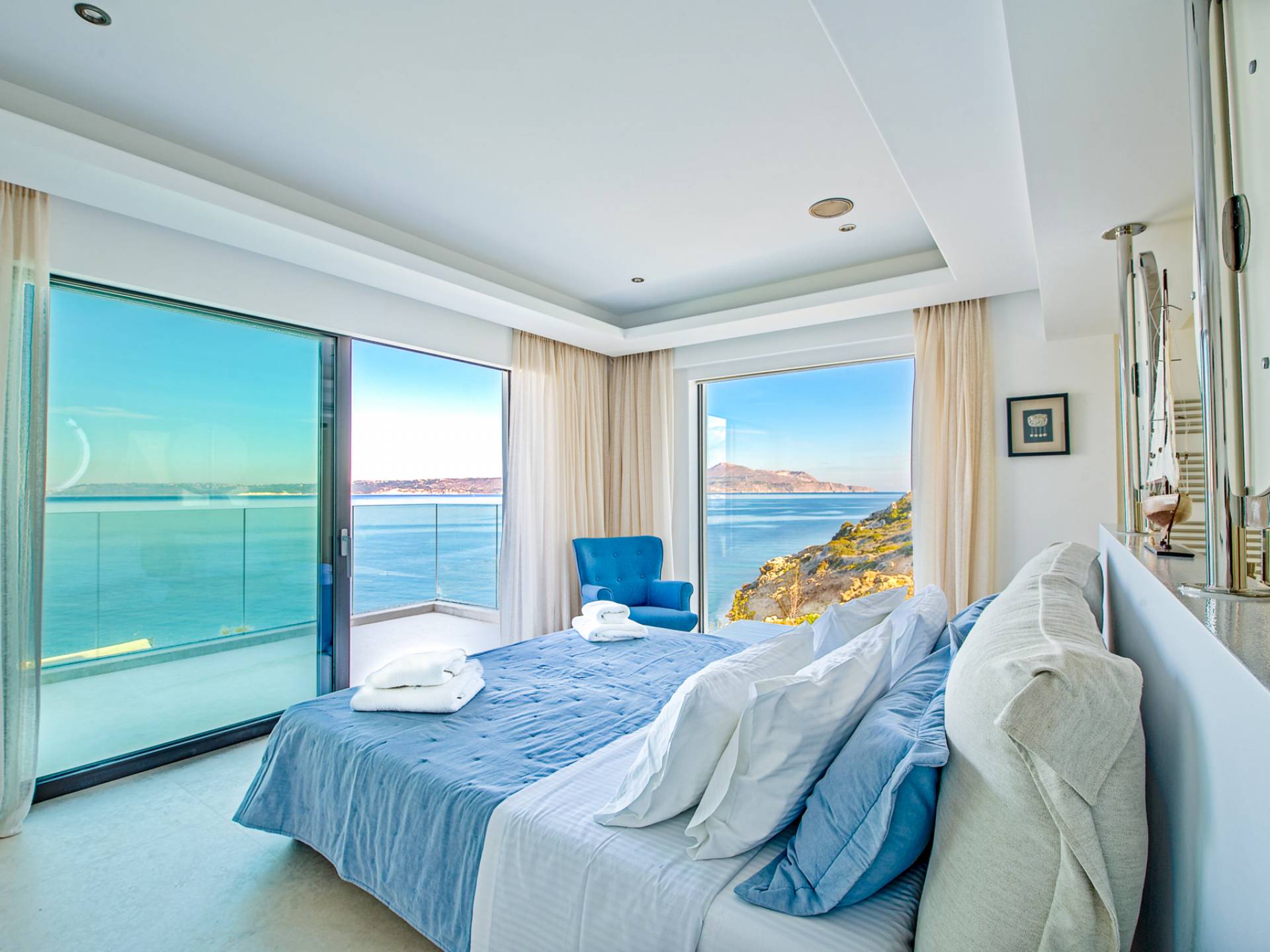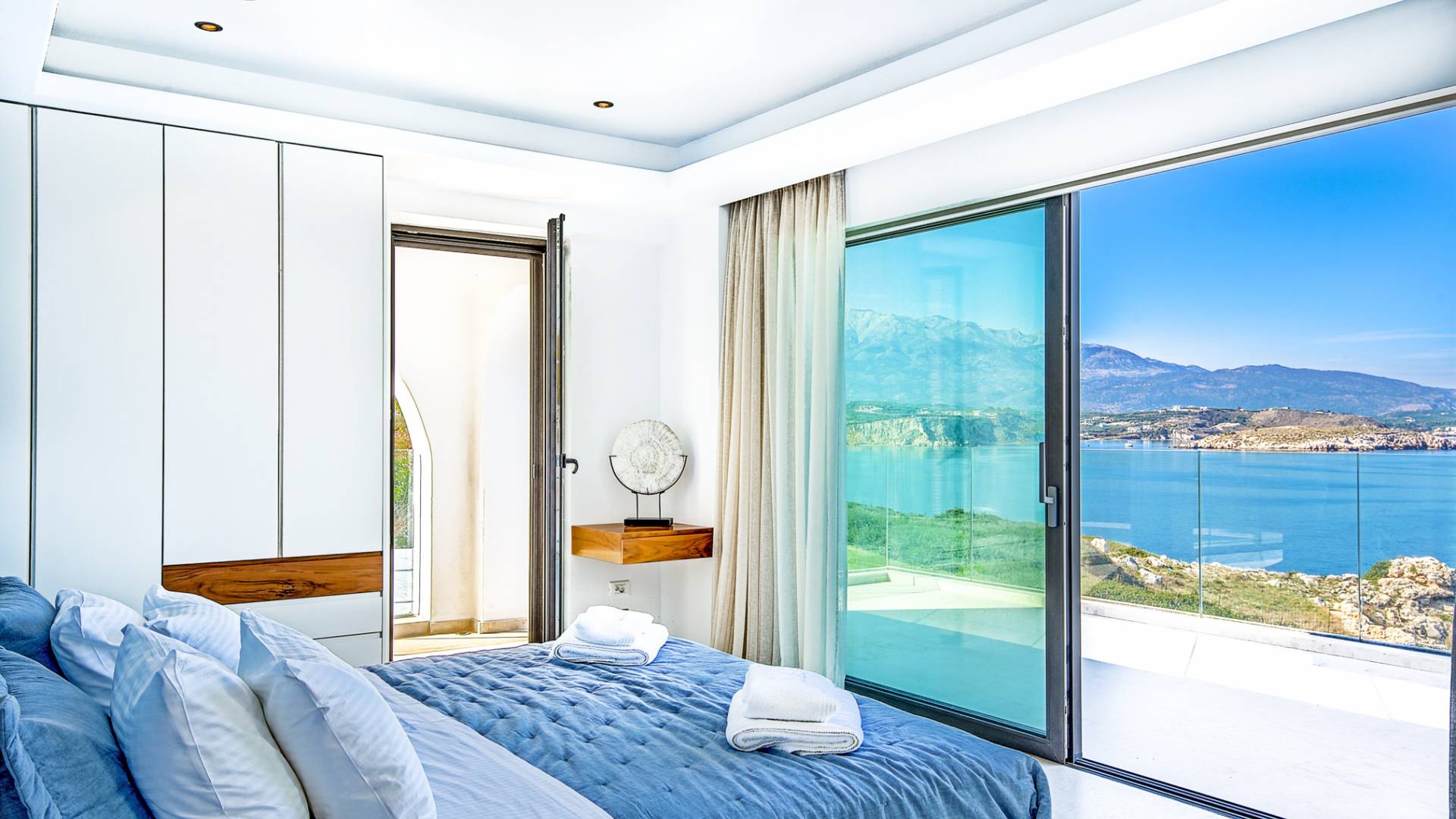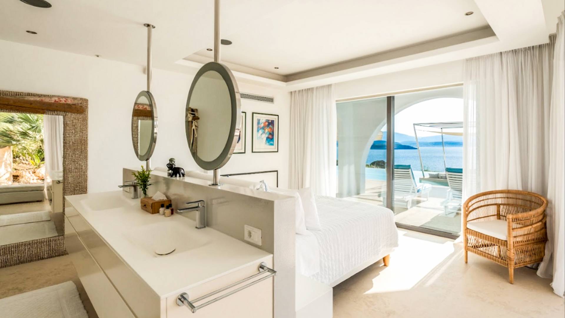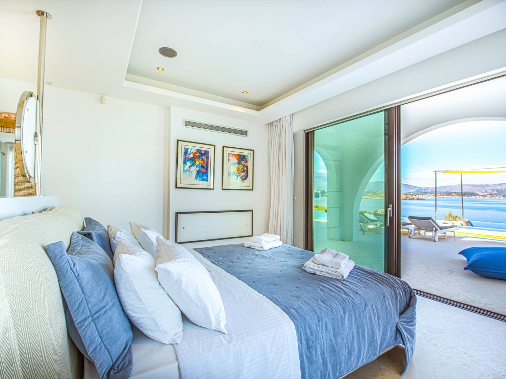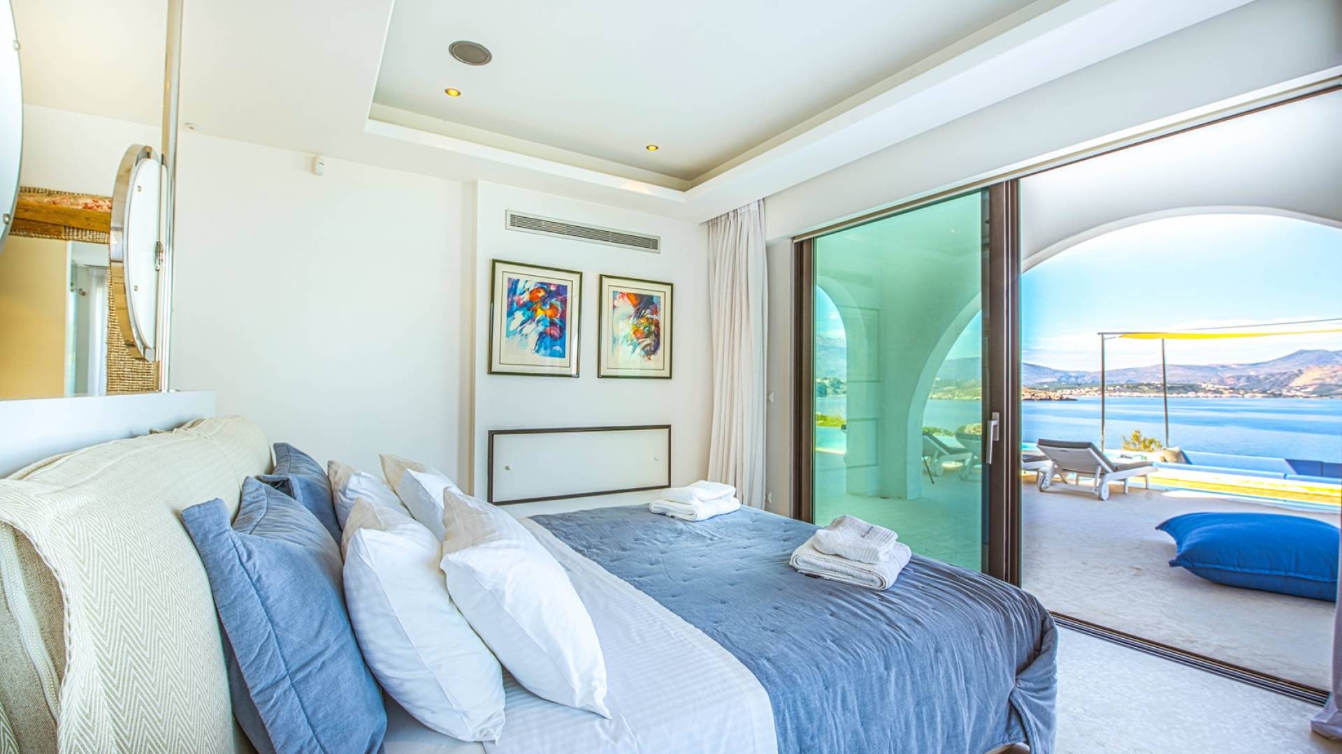Al piano terra della villa principale si trovano la master suite con letto king-size, doccia all'aperto, vista mare e terrazza coperta di fronte alla piscina riscaldata a sfioro di acqua salata. Al secondo piano con ascensore e scale si trova una seconda master suite con letto king-size, vista mare e accesso al giardino. La terza camera ha due letti singoli convertibili in un letto king-size, una terrazza coperta con vista mare con divano letto e attrezzi ginnici.