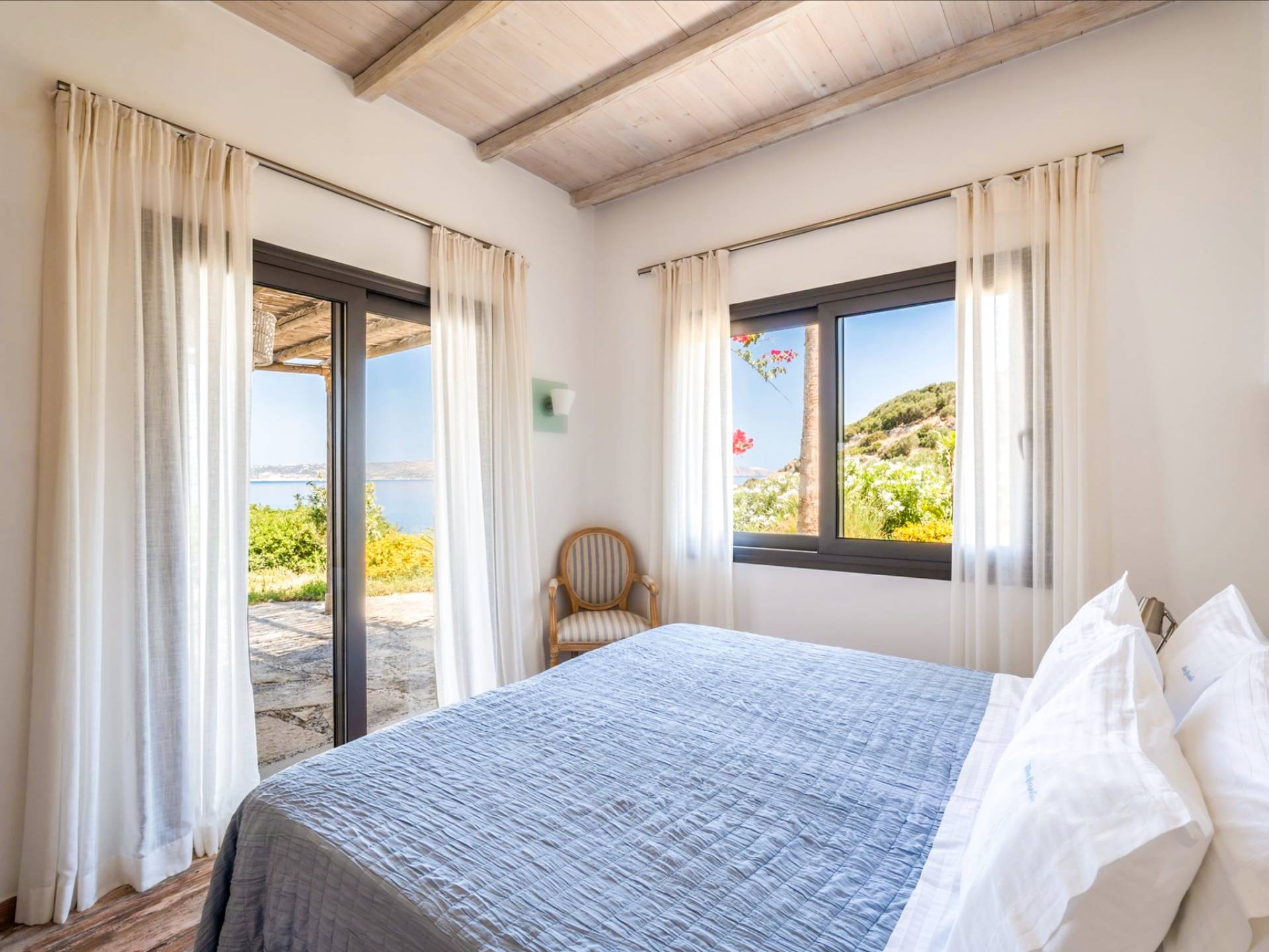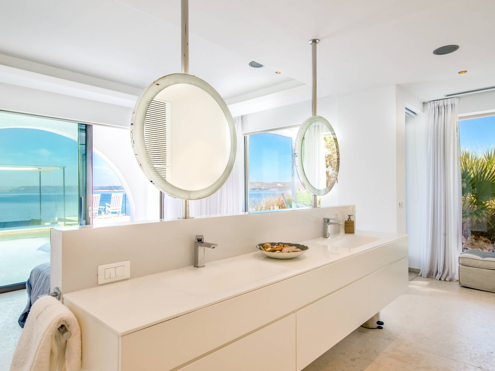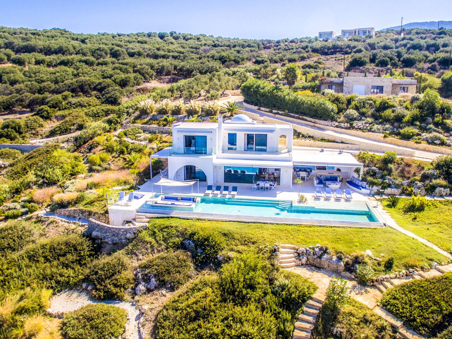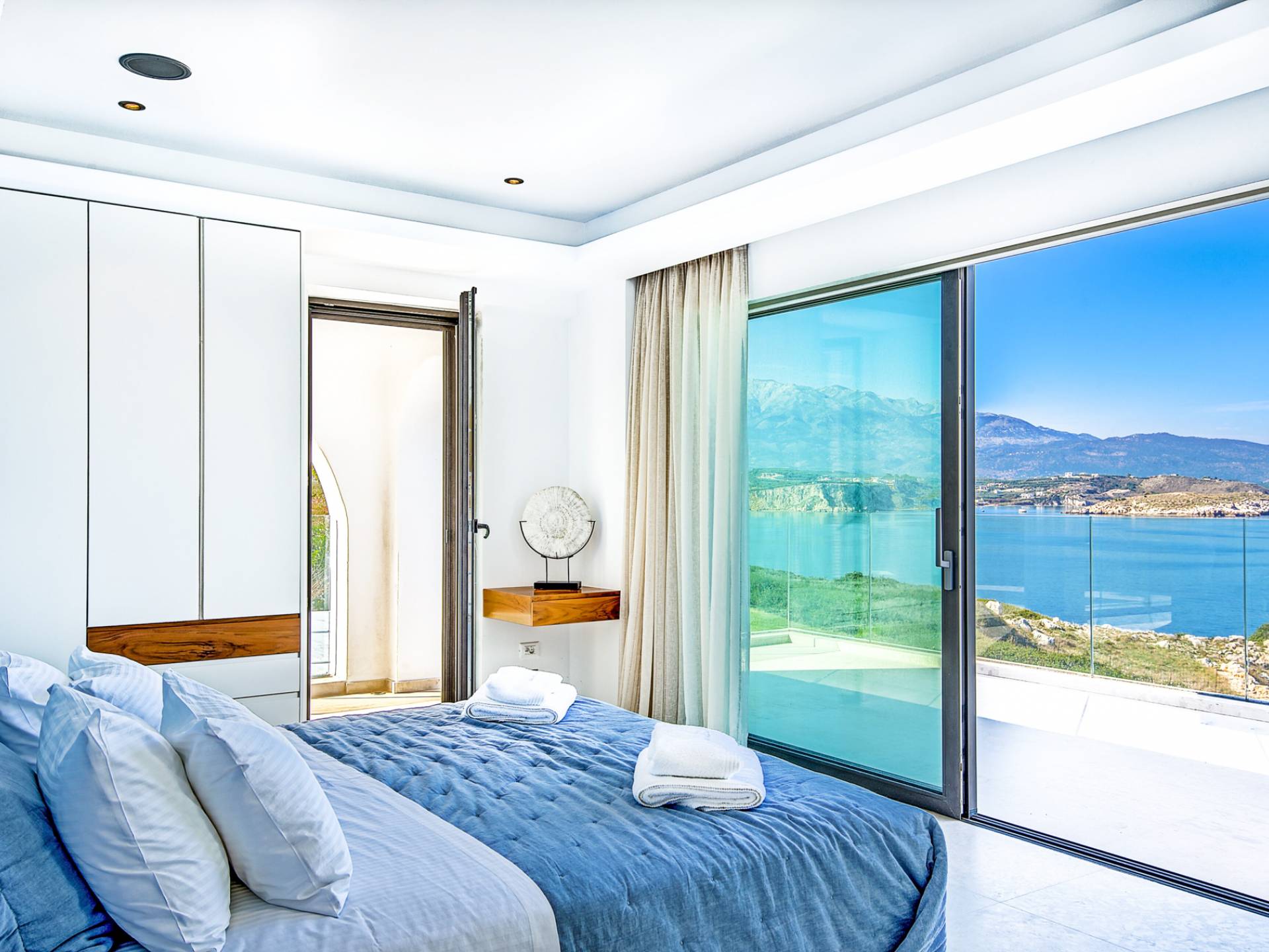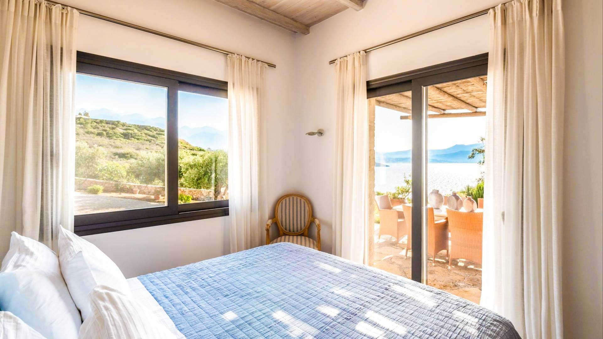 Al piano terra della villa principale si trovano la master suite con letto king-size, doccia all'aperto, vista mare e terrazza coperta di fronte alla piscina riscaldata a sfioro di acqua salata. Al secondo piano con ascensore e scale si trova una seconda master suite con letto king-size, vista mare e accesso al giardino. La terza camera ha due letti singoli convertibili in un letto king-size, una terrazza coperta con vista mare con divano letto e attrezzi ginnici.