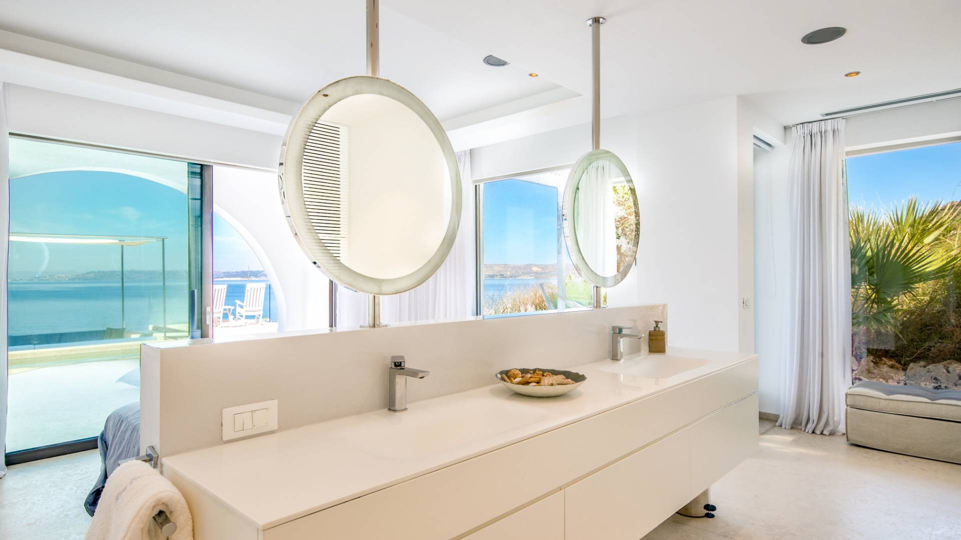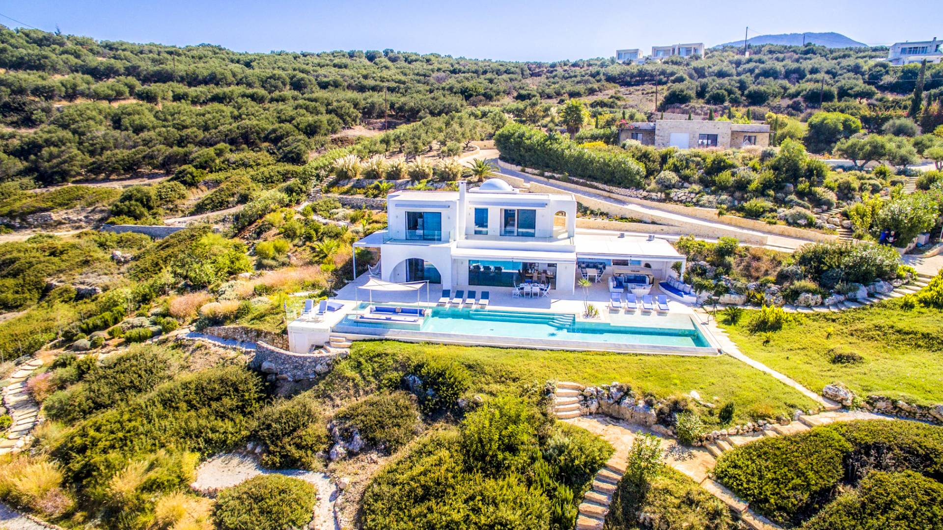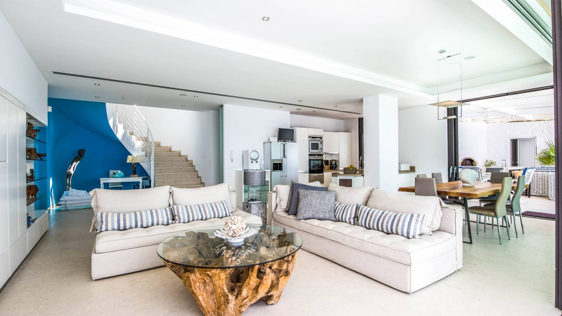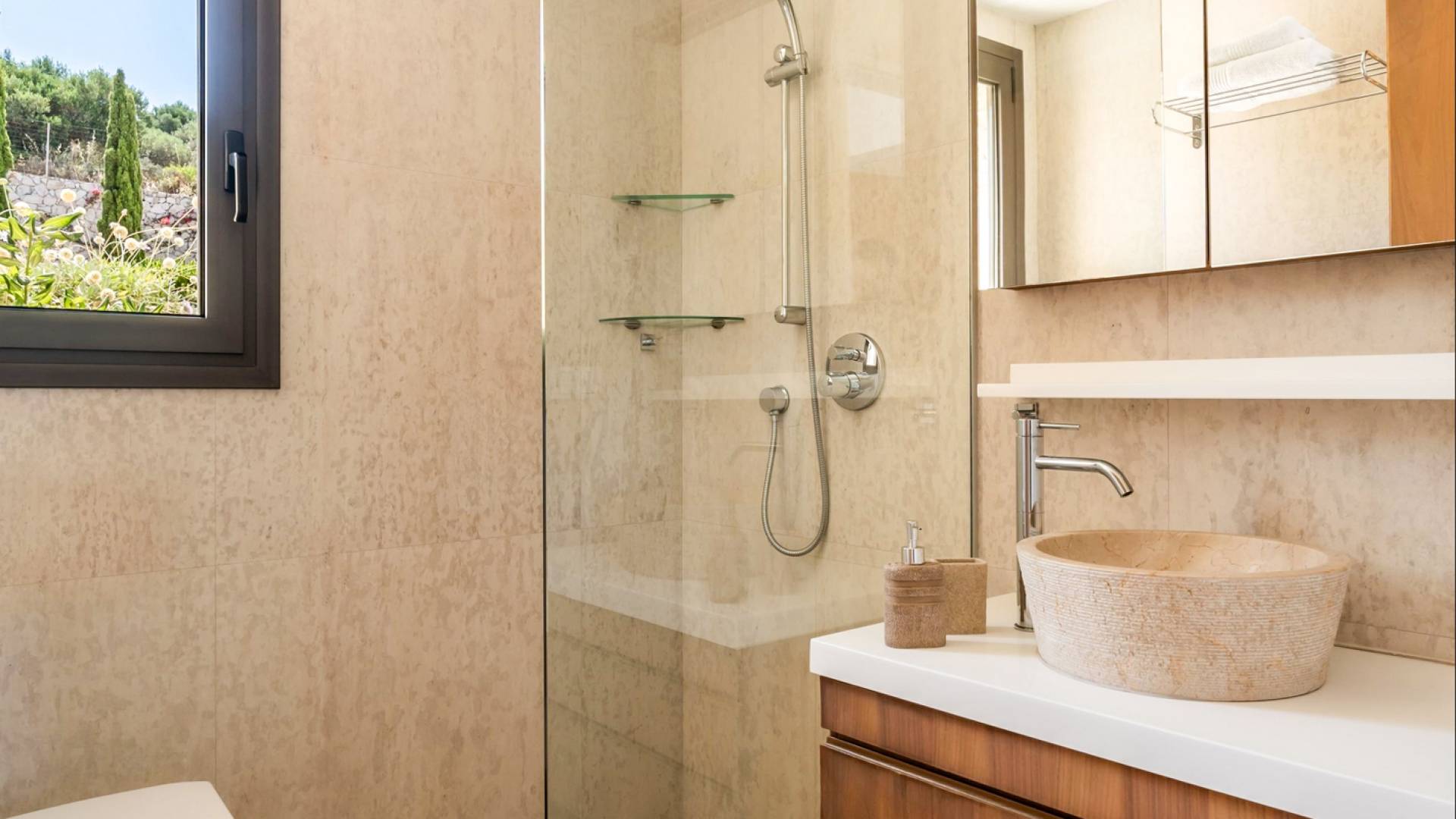 Al piano terra della villa principale si trovano la master suite con letto king-size, doccia all'aperto, vista mare e terrazza coperta di fronte alla piscina riscaldata a sfioro di acqua salata. Al secondo piano con ascensore e scale si trova una seconda master suite con letto king-size, vista mare e accesso al giardino. La terza camera ha due letti singoli convertibili in un letto king-size, una terrazza coperta con vista mare con divano letto e attrezzi ginnici.
