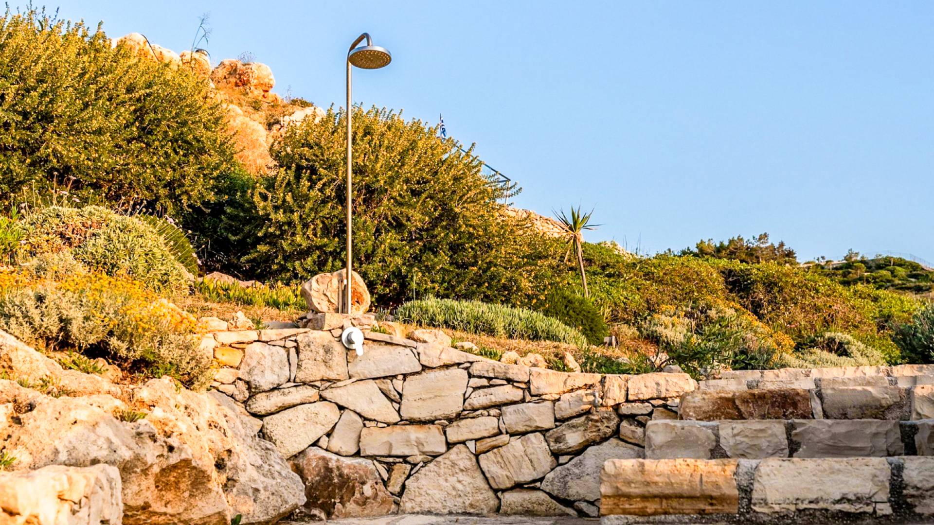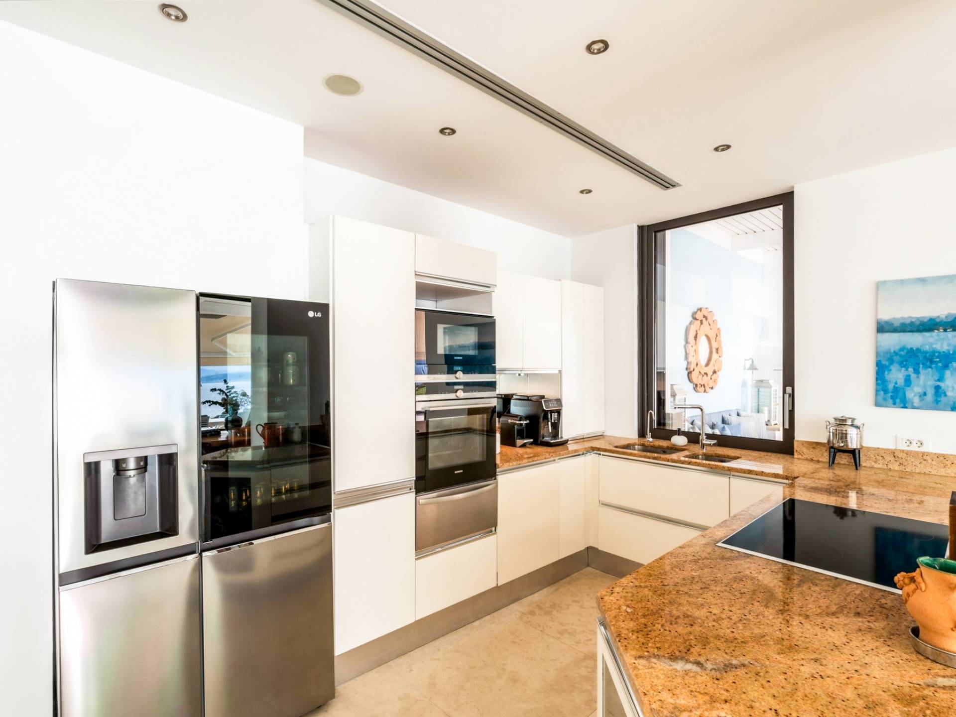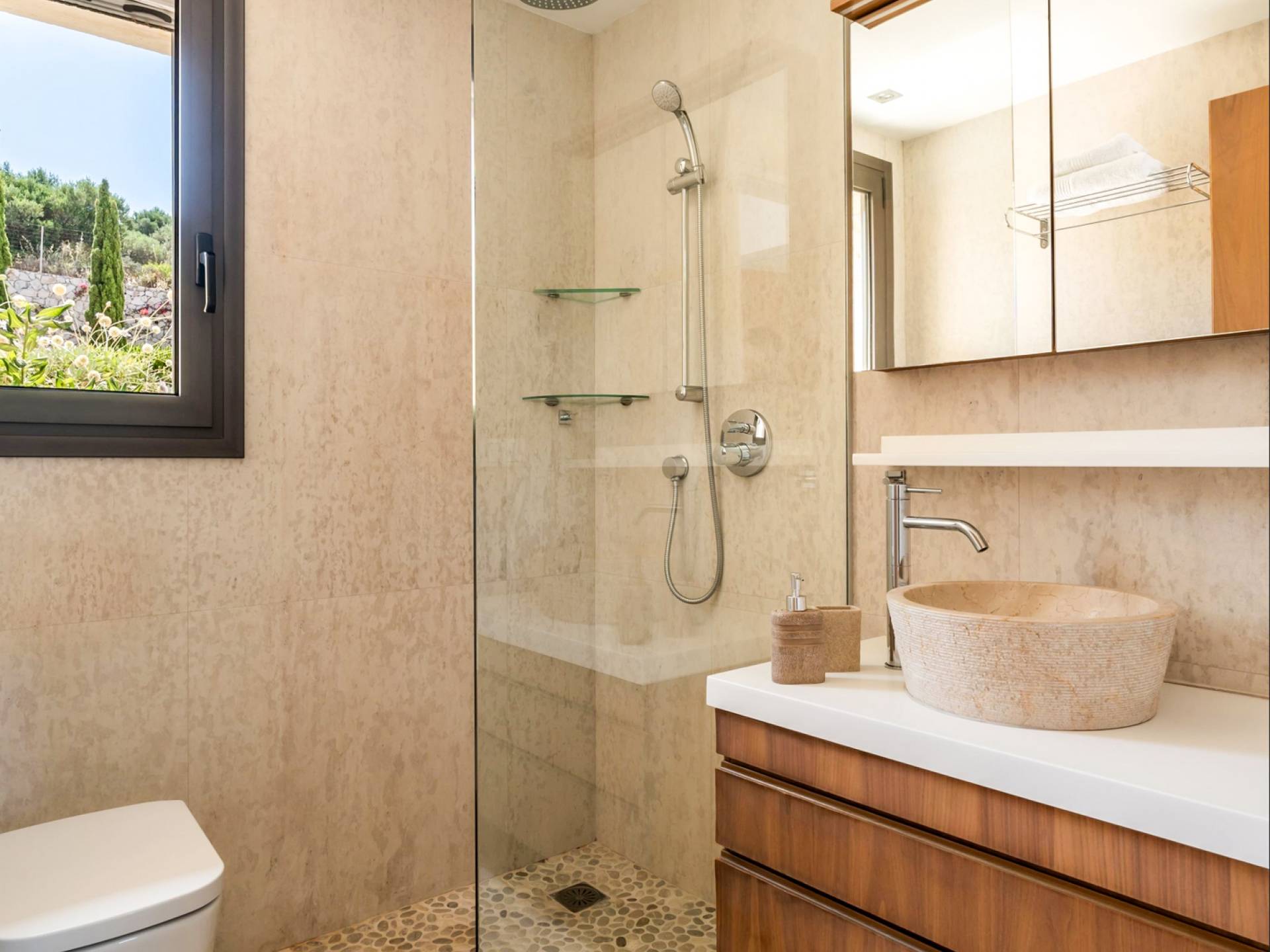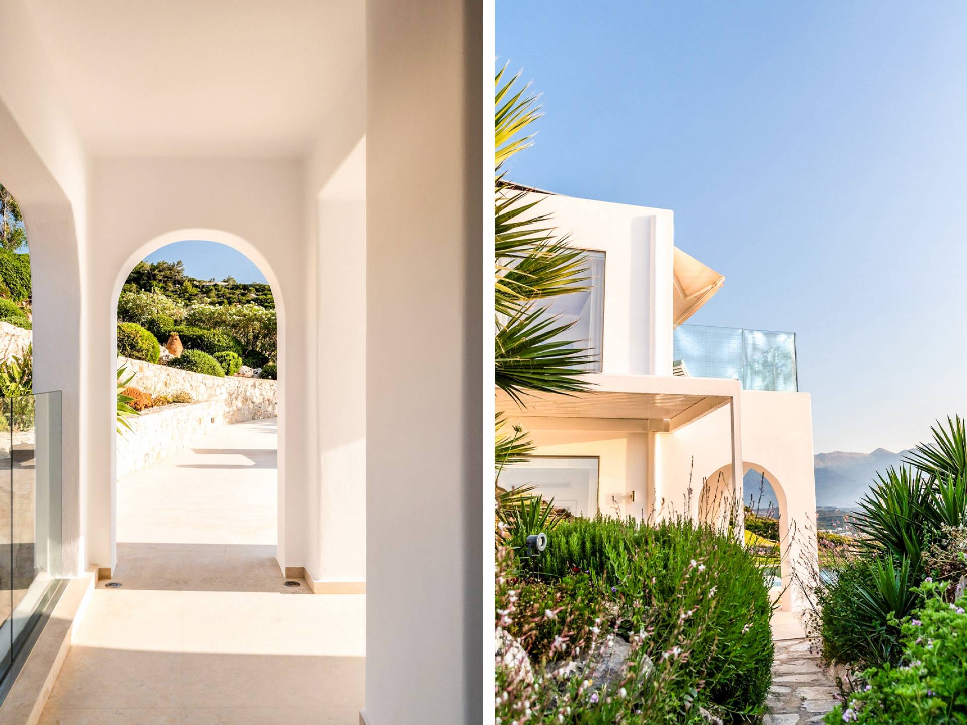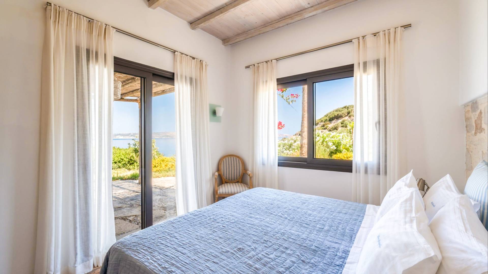 Al piano terra della villa principale si trovano la master suite con letto king-size, doccia all'aperto, vista mare e terrazza coperta di fronte alla piscina riscaldata a sfioro di acqua salata. Al secondo piano con ascensore e scale si trova una seconda master suite con letto king-size, vista mare e accesso al giardino. La terza camera ha due letti singoli convertibili in un letto king-size, una terrazza coperta con vista mare con divano letto e attrezzi ginnici.