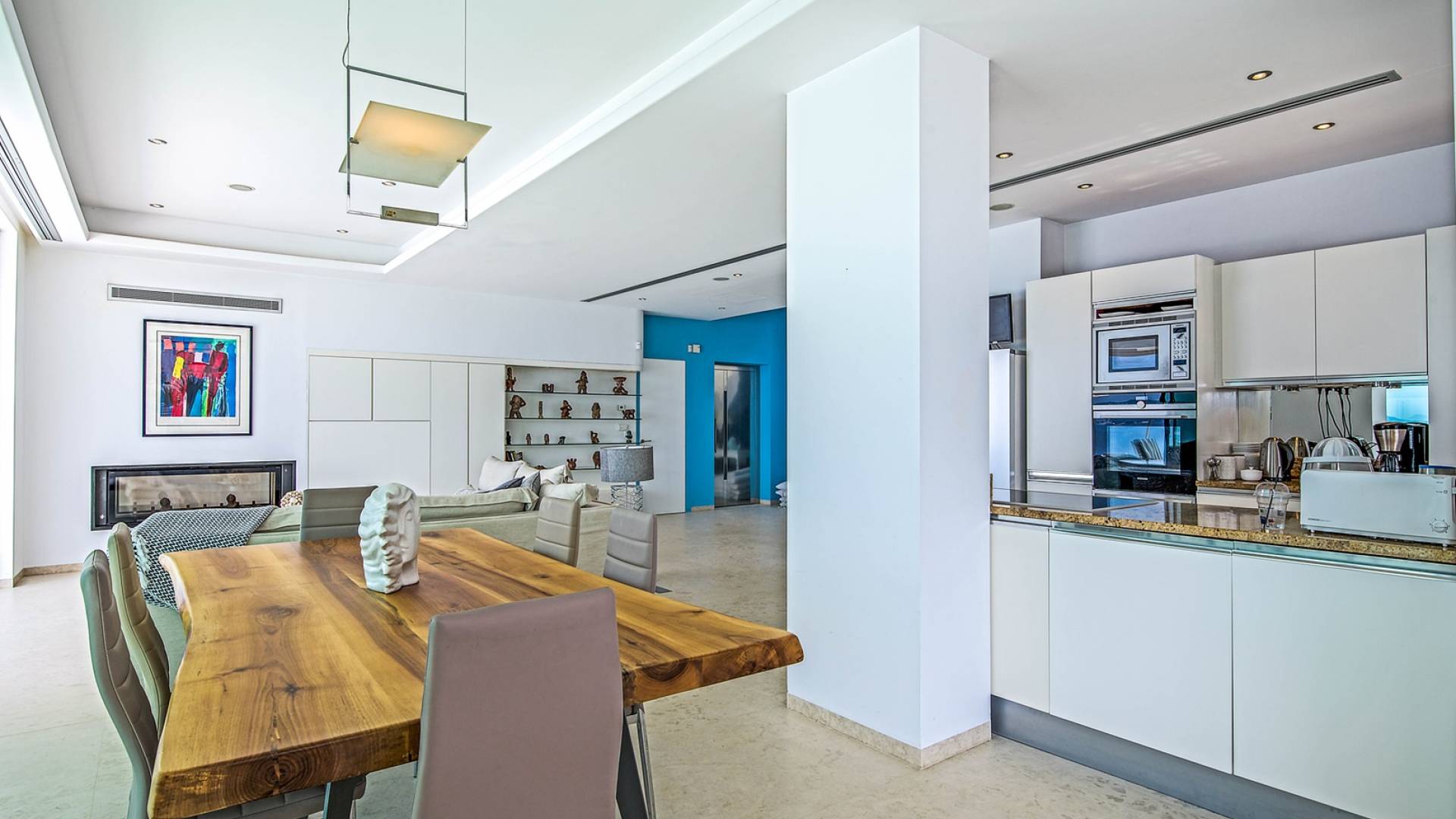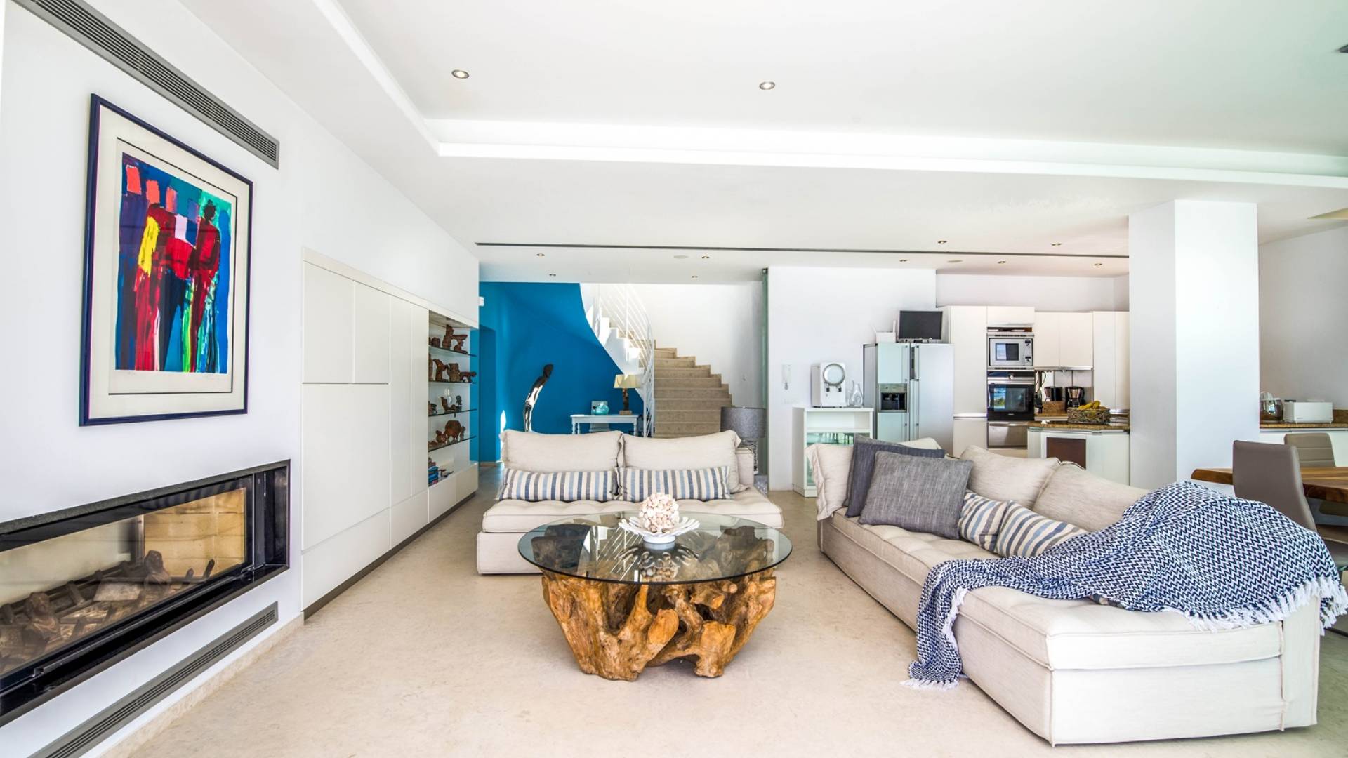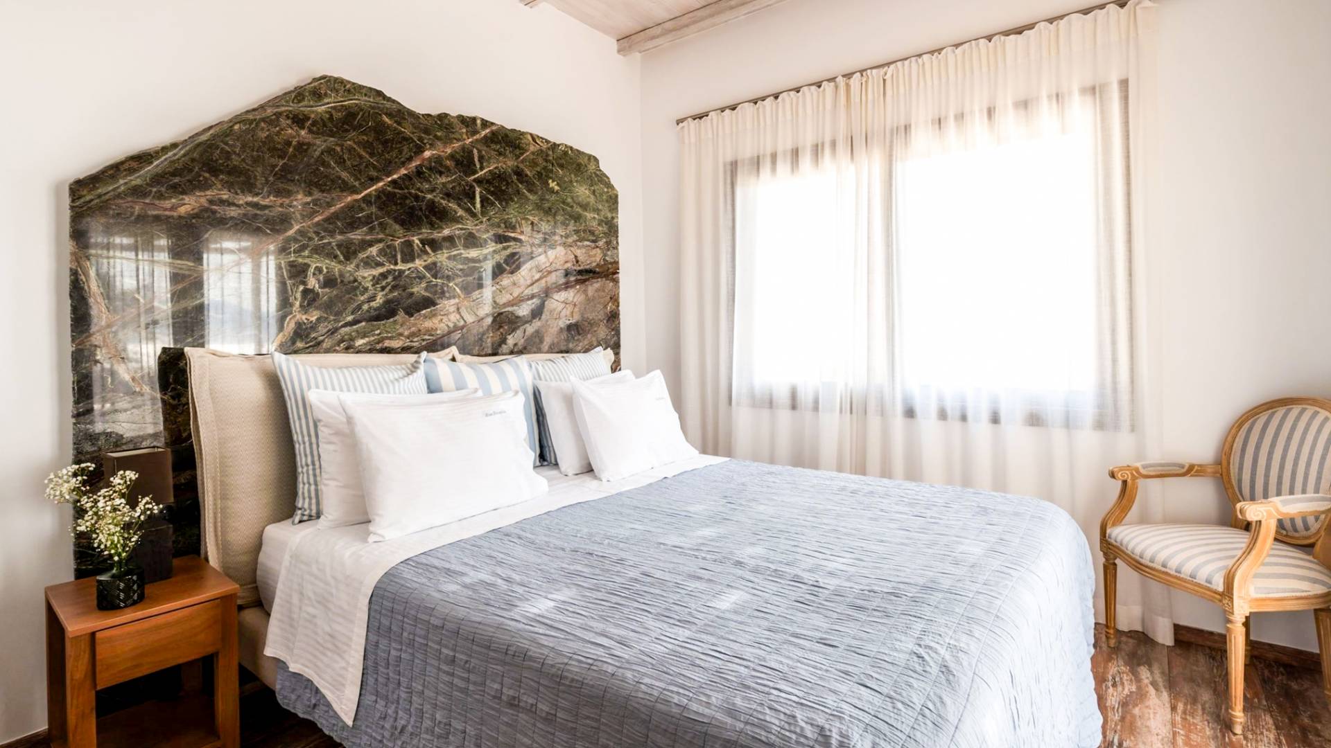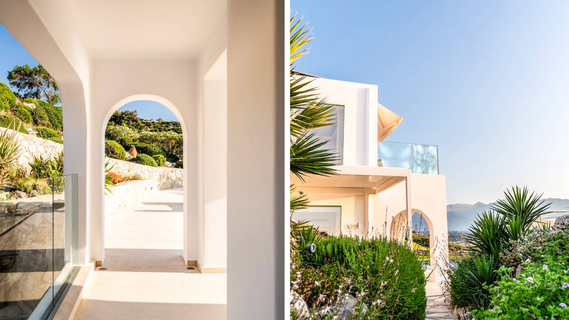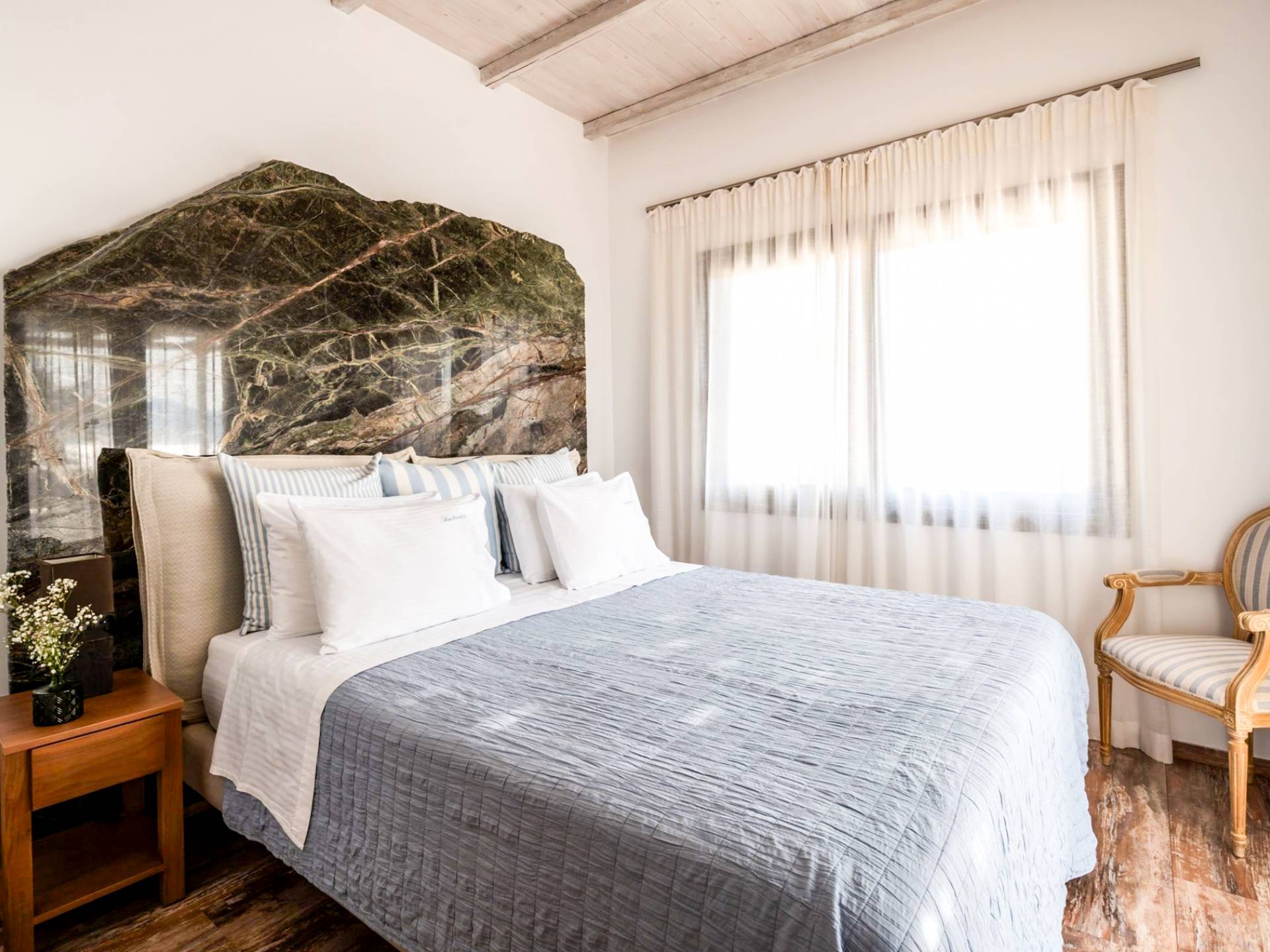 Al piano terra della villa principale si trovano la master suite con letto king-size, doccia all'aperto, vista mare e terrazza coperta di fronte alla piscina riscaldata a sfioro di acqua salata. Al secondo piano con ascensore e scale si trova una seconda master suite con letto king-size, vista mare e accesso al giardino. La terza camera ha due letti singoli convertibili in un letto king-size, una terrazza coperta con vista mare con divano letto e attrezzi ginnici.
