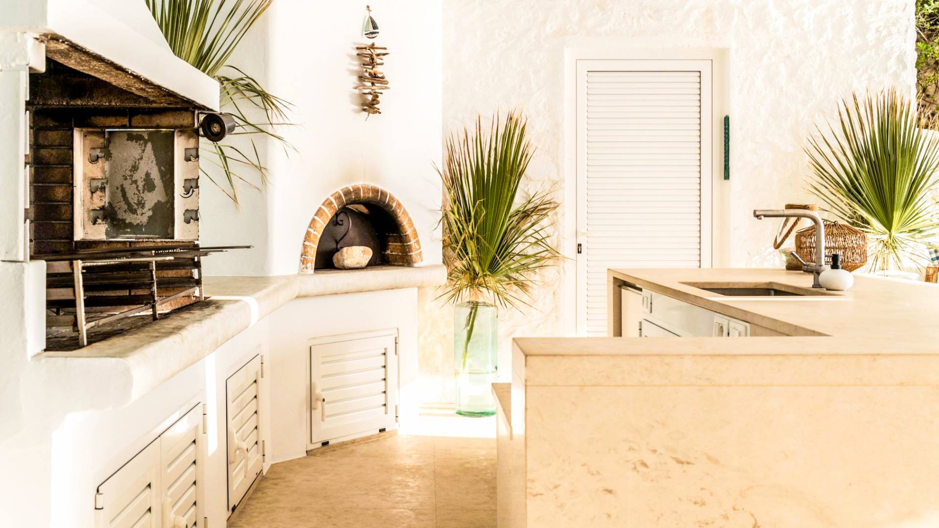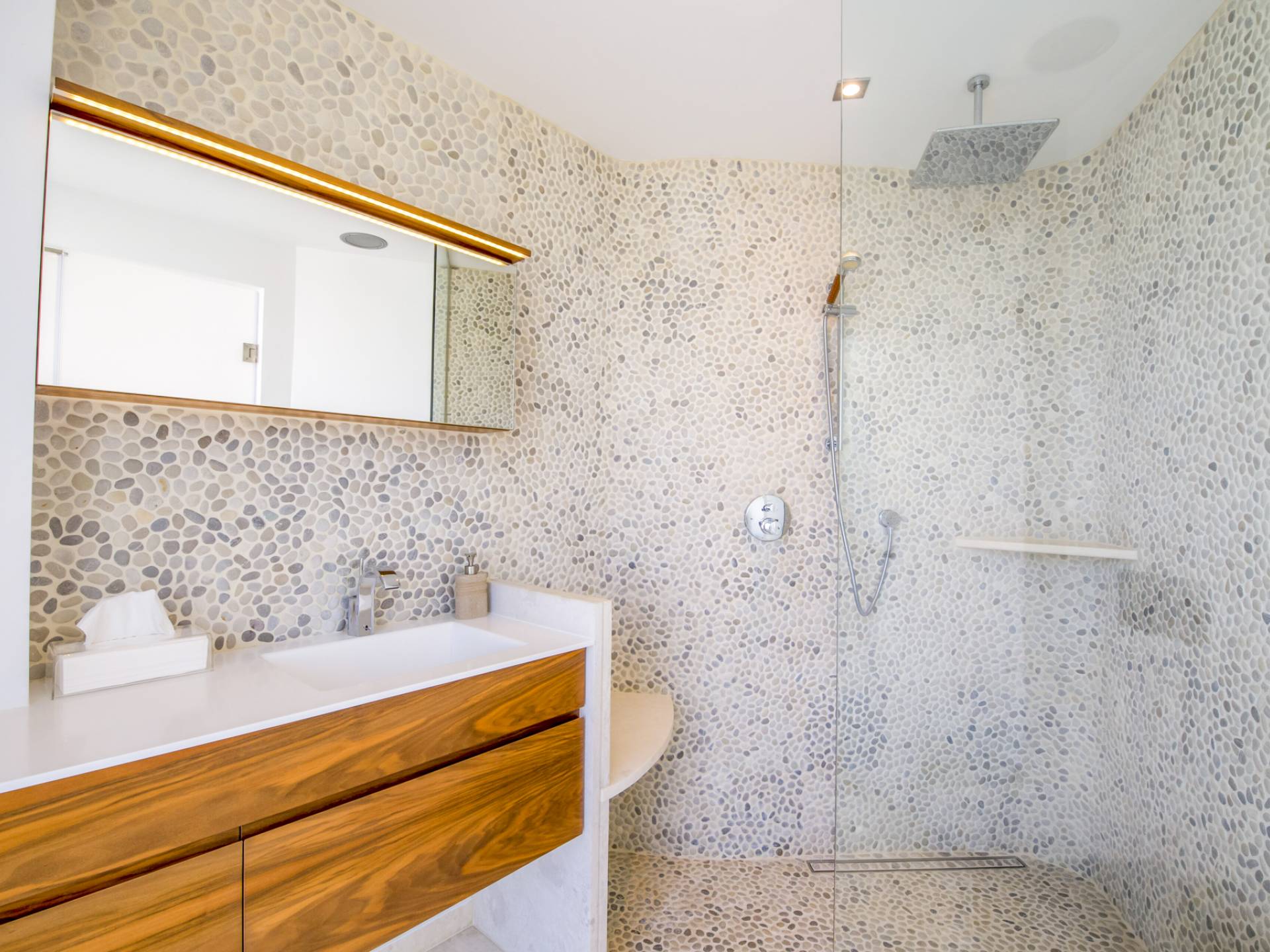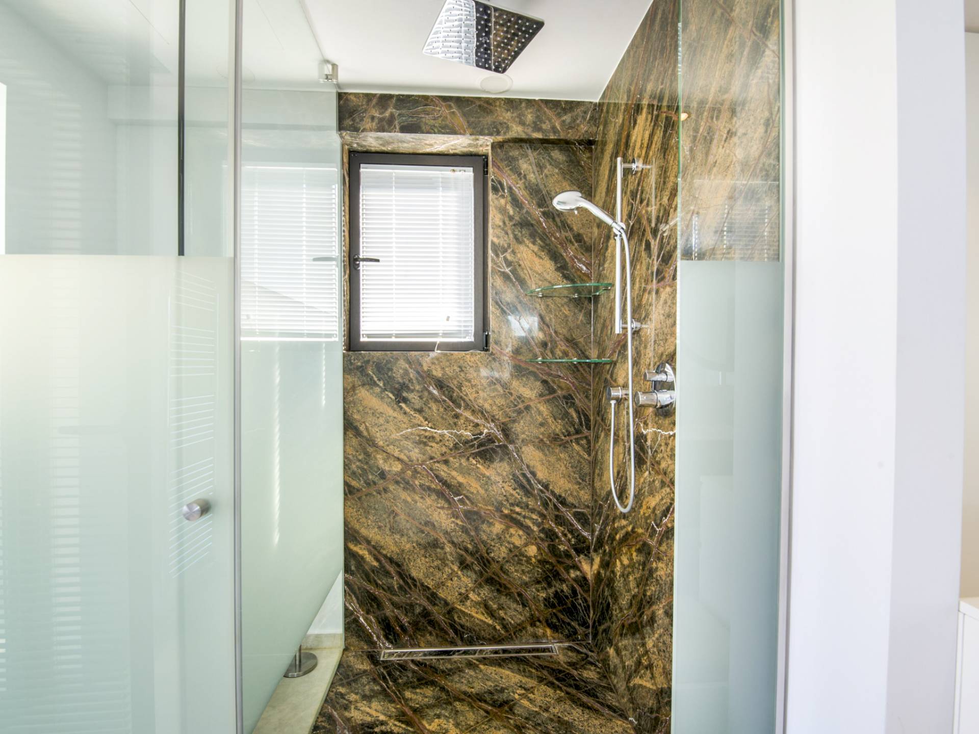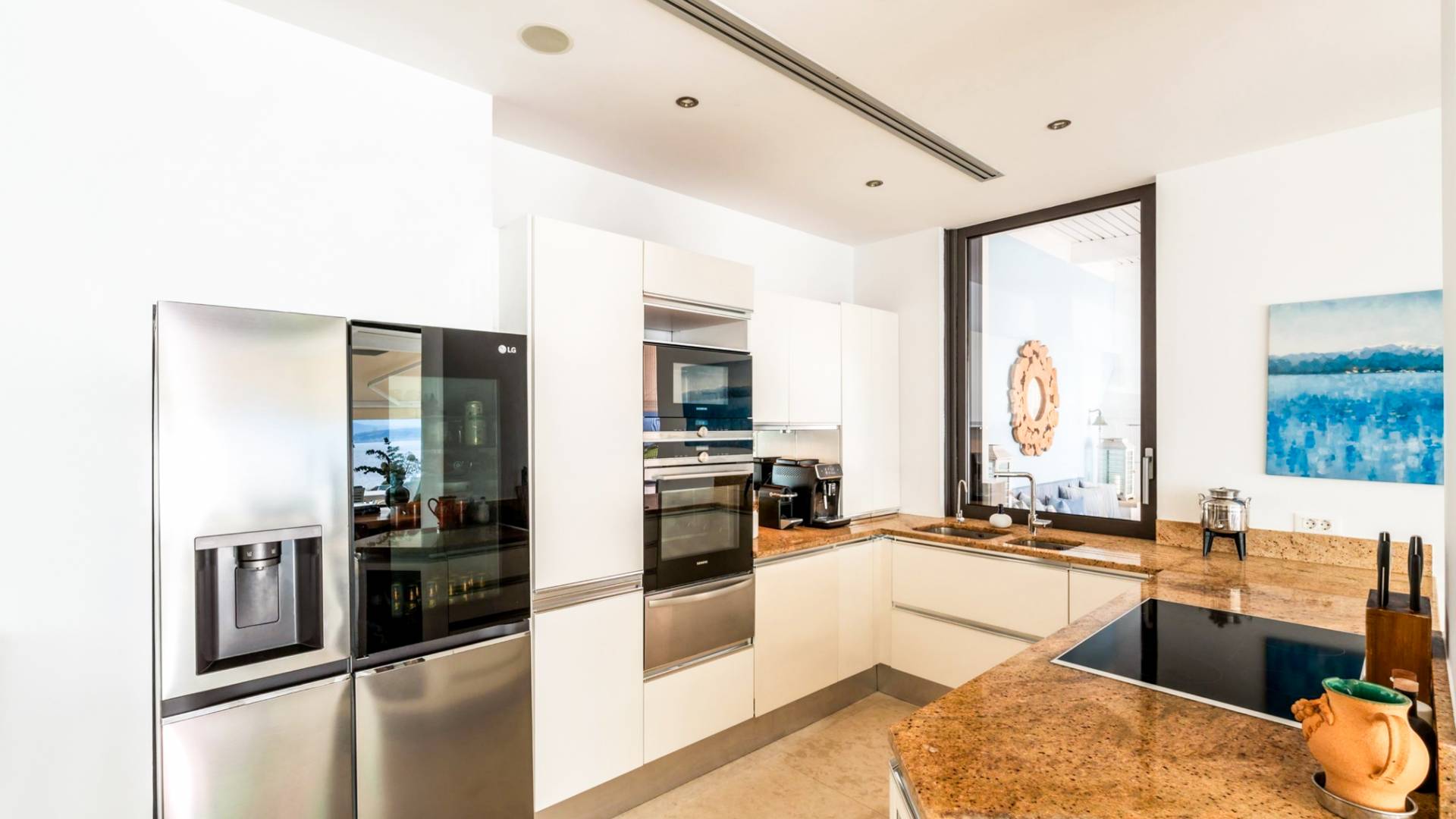 Al piano terra della villa principale si trovano la master suite con letto king-size, doccia all'aperto, vista mare e terrazza coperta di fronte alla piscina riscaldata a sfioro di acqua salata. Al secondo piano con ascensore e scale si trova una seconda master suite con letto king-size, vista mare e accesso al giardino. La terza camera ha due letti singoli convertibili in un letto king-size, una terrazza coperta con vista mare con divano letto e attrezzi ginnici.