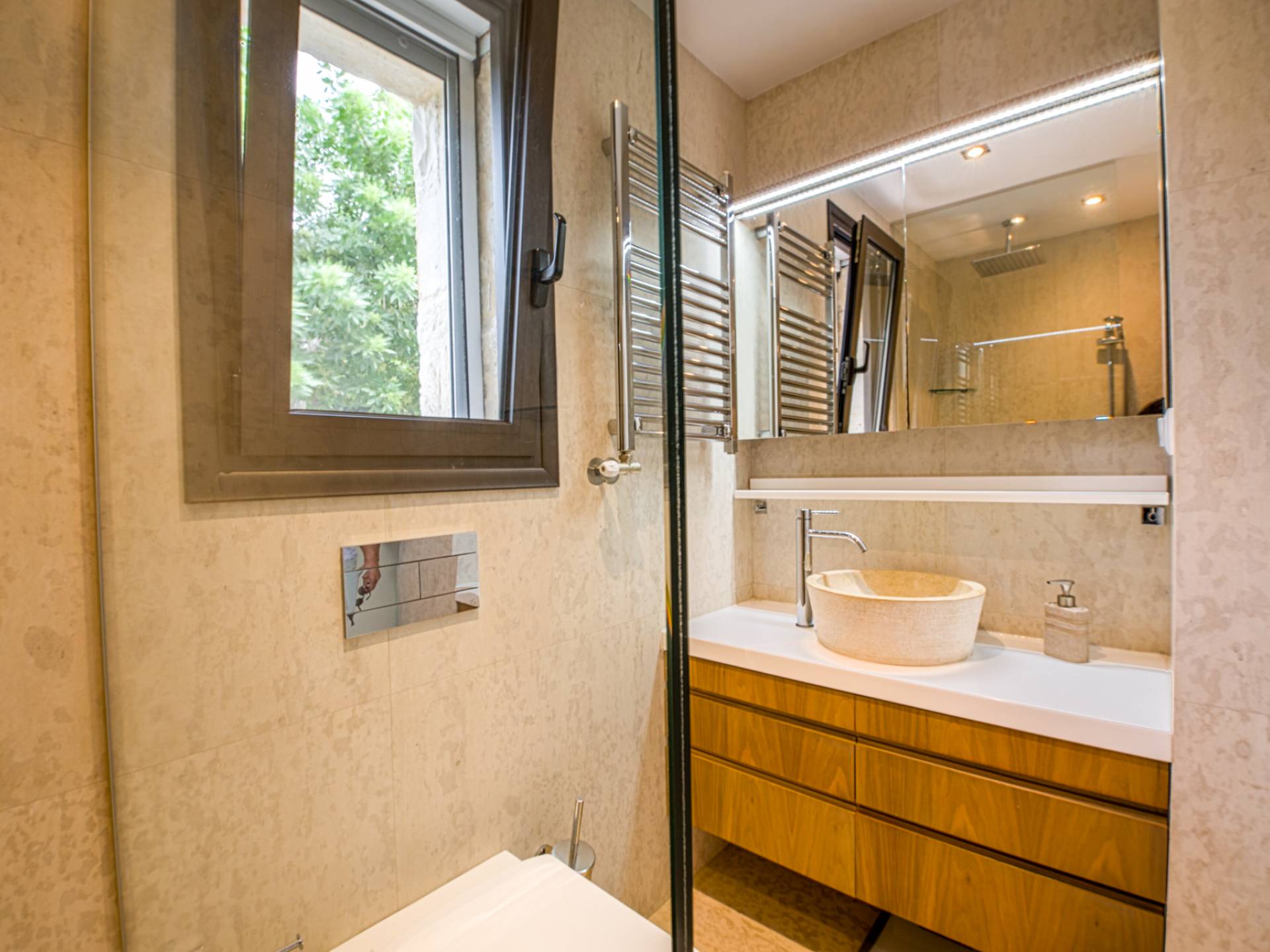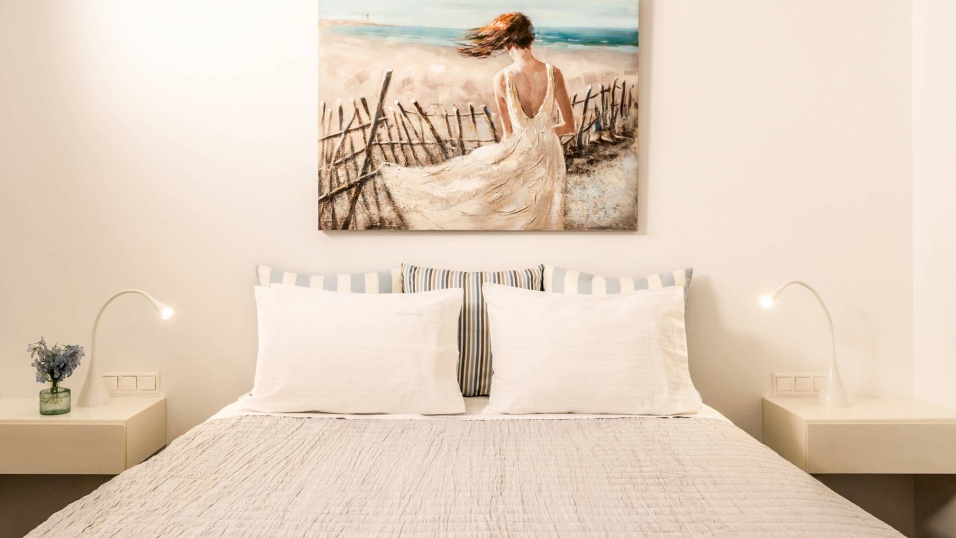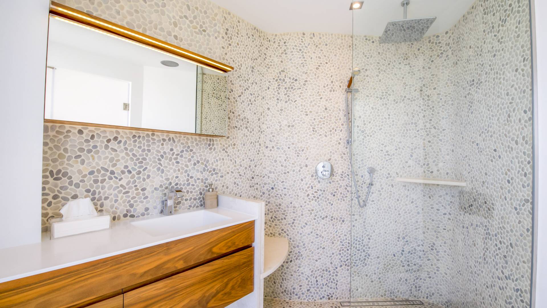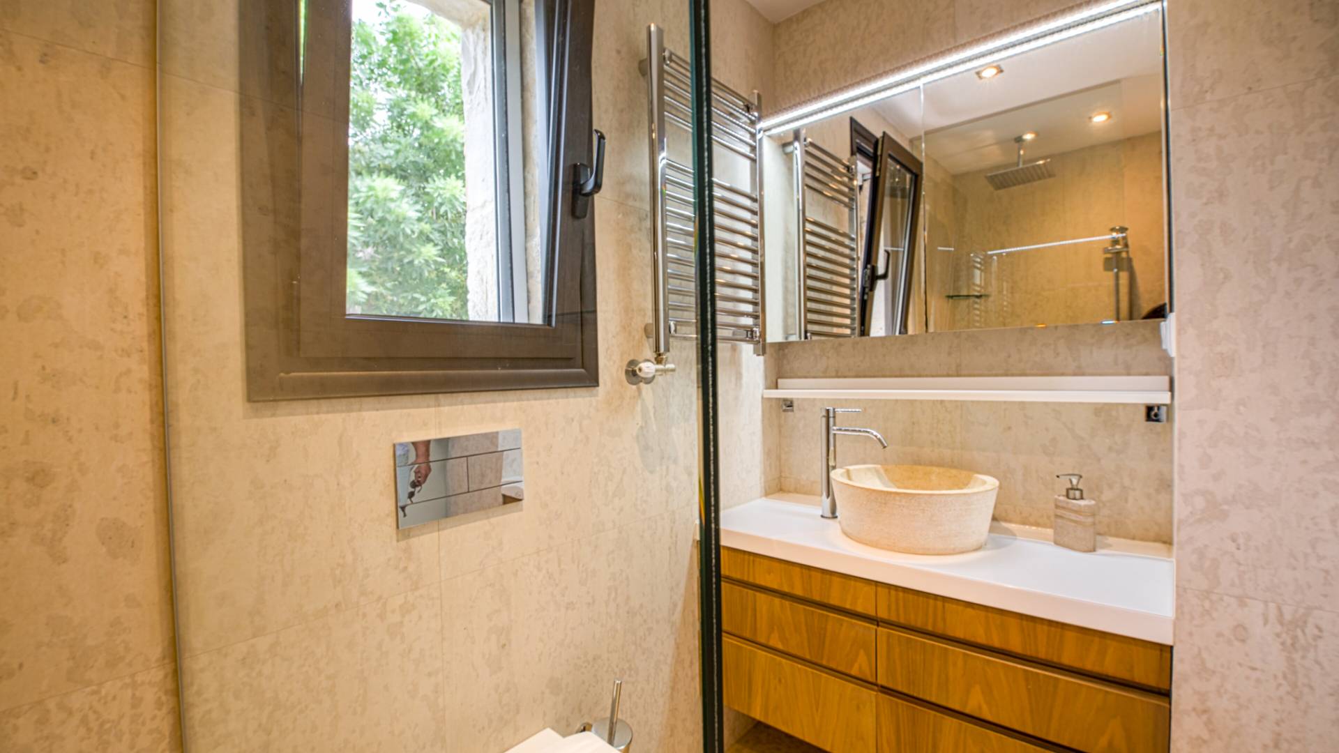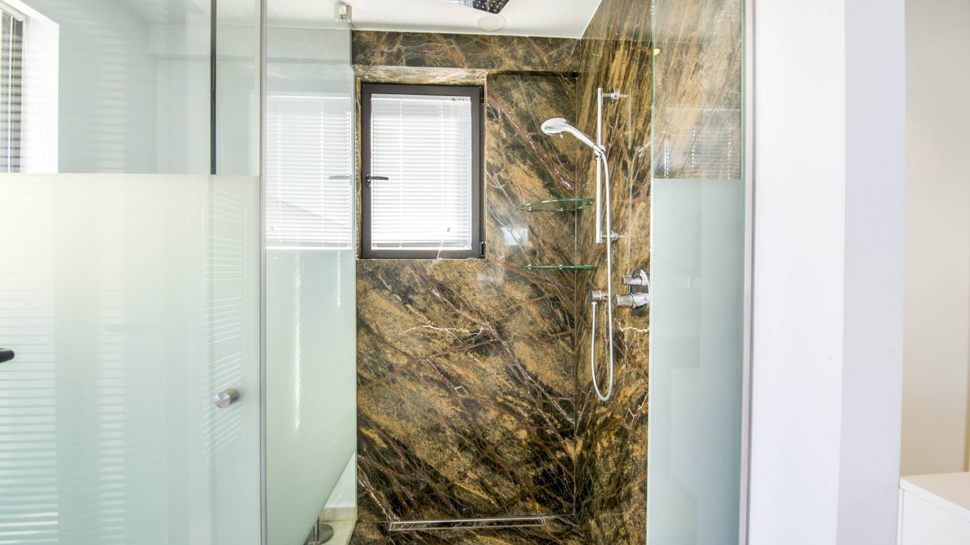 Al piano terra della villa principale si trovano la master suite con letto king-size, doccia all'aperto, vista mare e terrazza coperta di fronte alla piscina riscaldata a sfioro di acqua salata. Al secondo piano con ascensore e scale si trova una seconda master suite con letto king-size, vista mare e accesso al giardino. La terza camera ha due letti singoli convertibili in un letto king-size, una terrazza coperta con vista mare con divano letto e attrezzi ginnici.