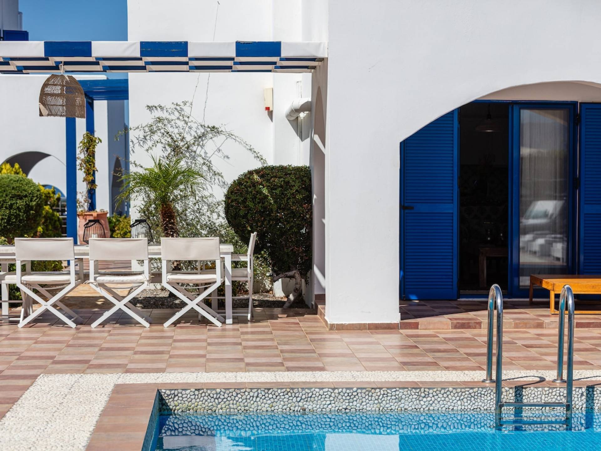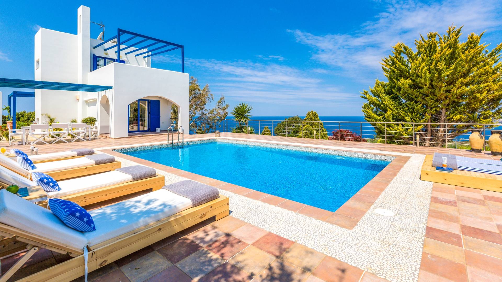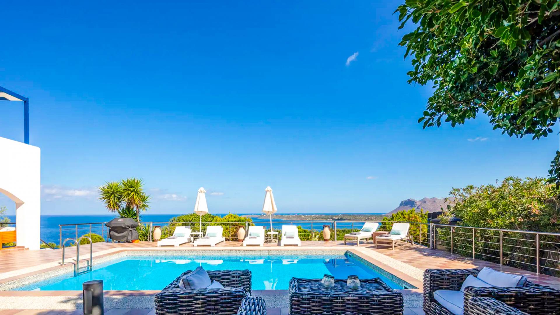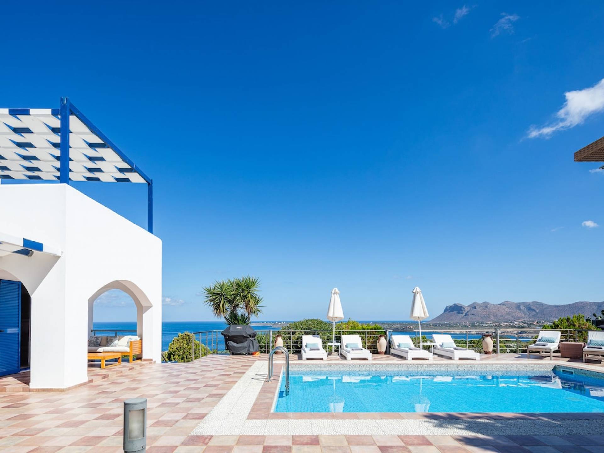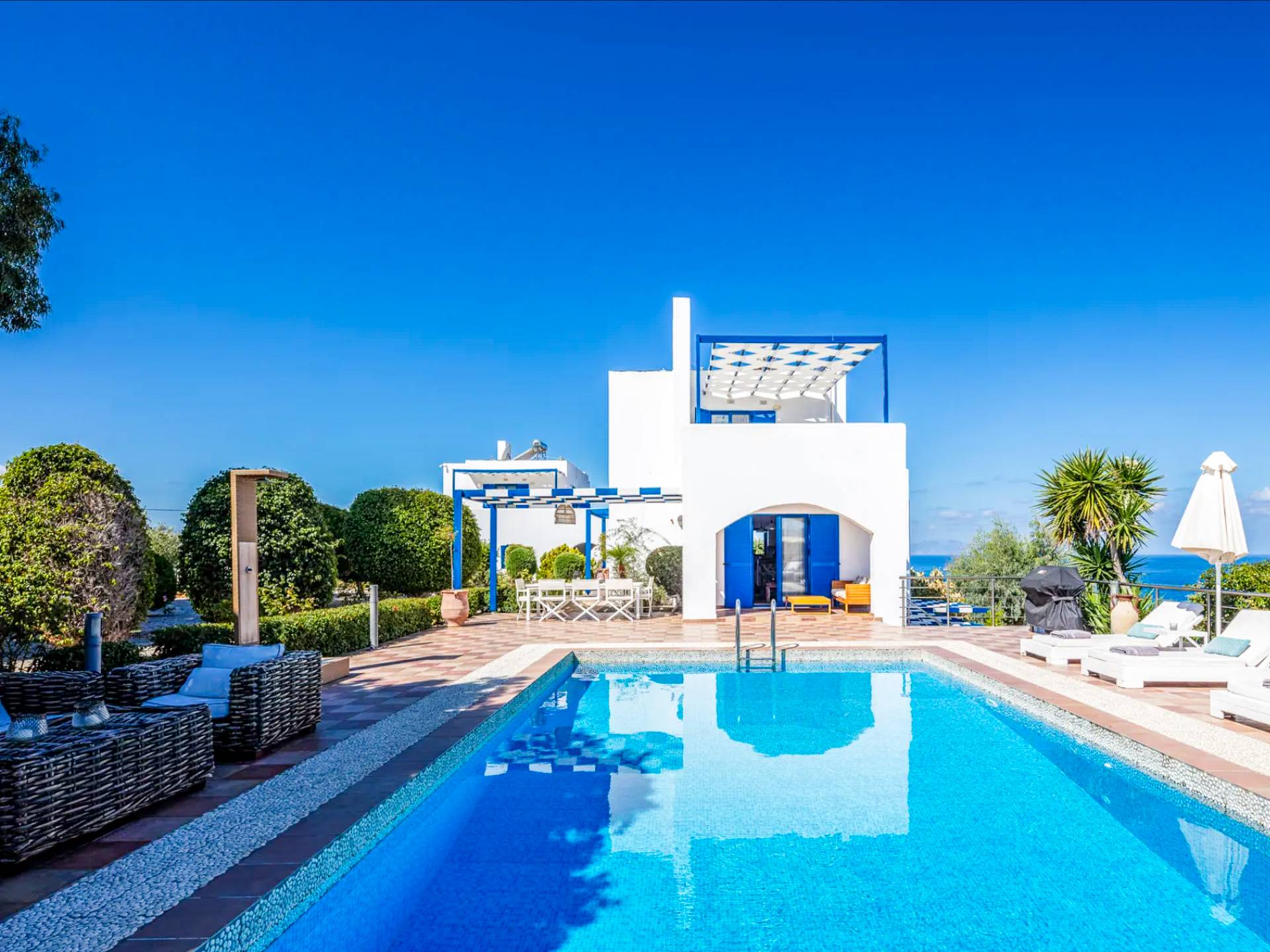 The outdoor area is the heart of the villa, centered around a sparkling, crystal-clear swimming pool with sun loungers and umbrellas for all-day relaxation. A shaded pergola with an outdoor dining table and BBQ sets the scene for long, leisurely meals, where you can soak in the sea views, warm sunshine, and the gentle coastal breeze.