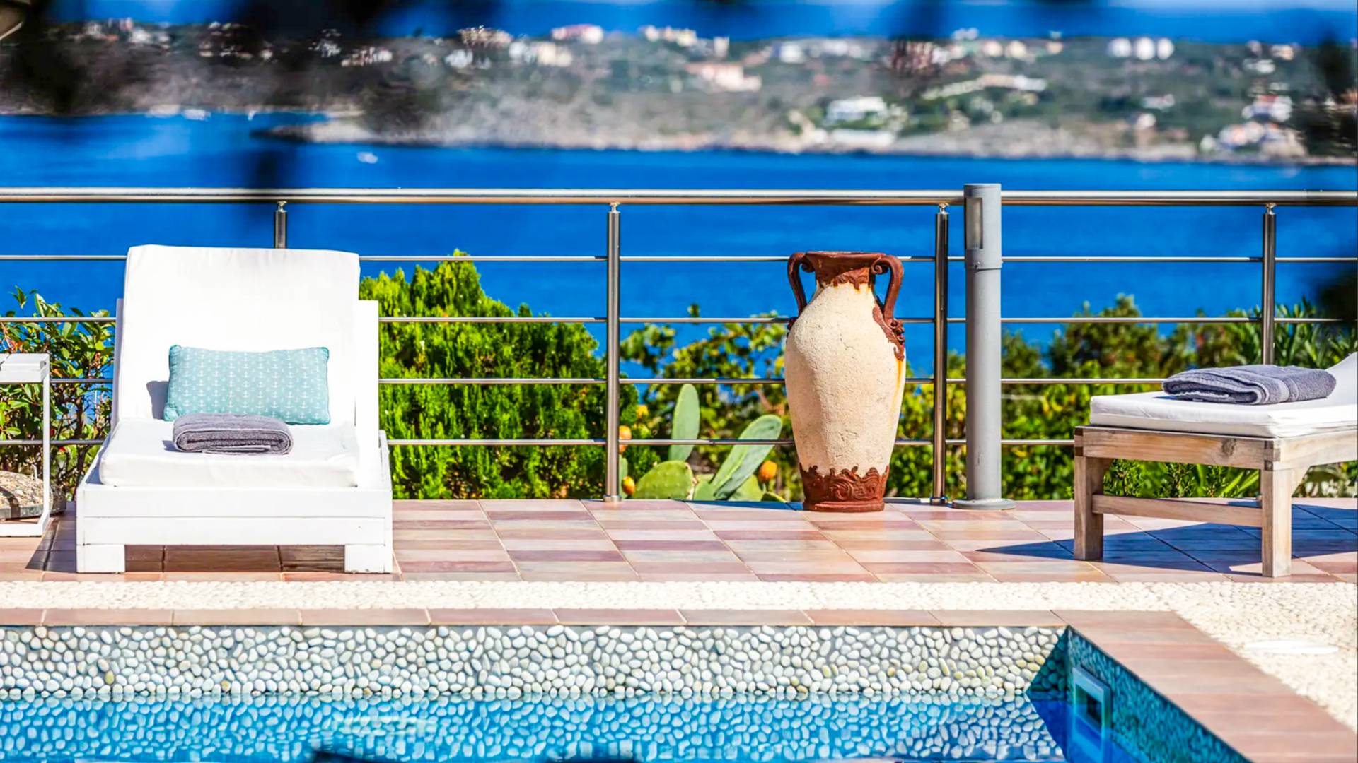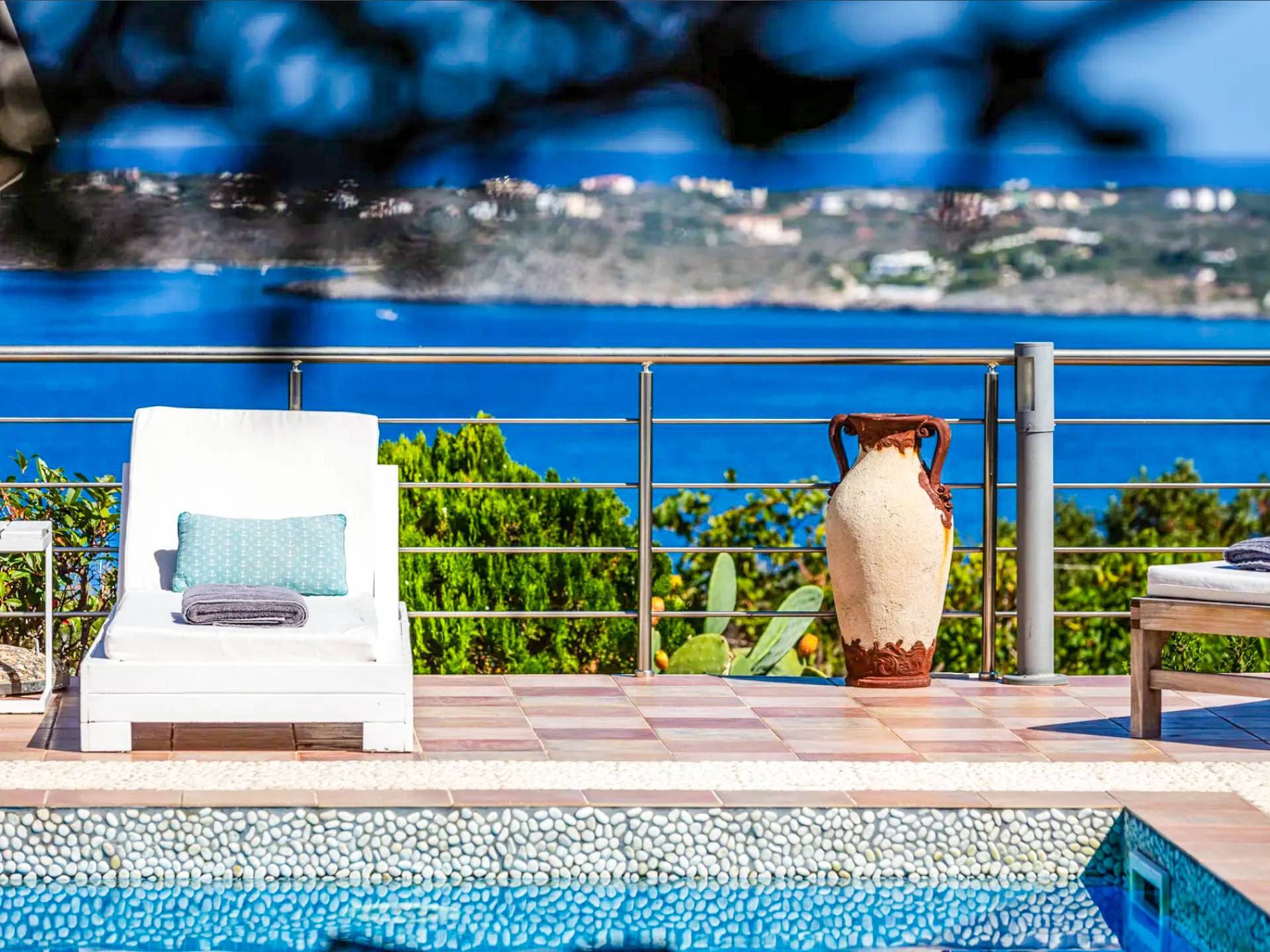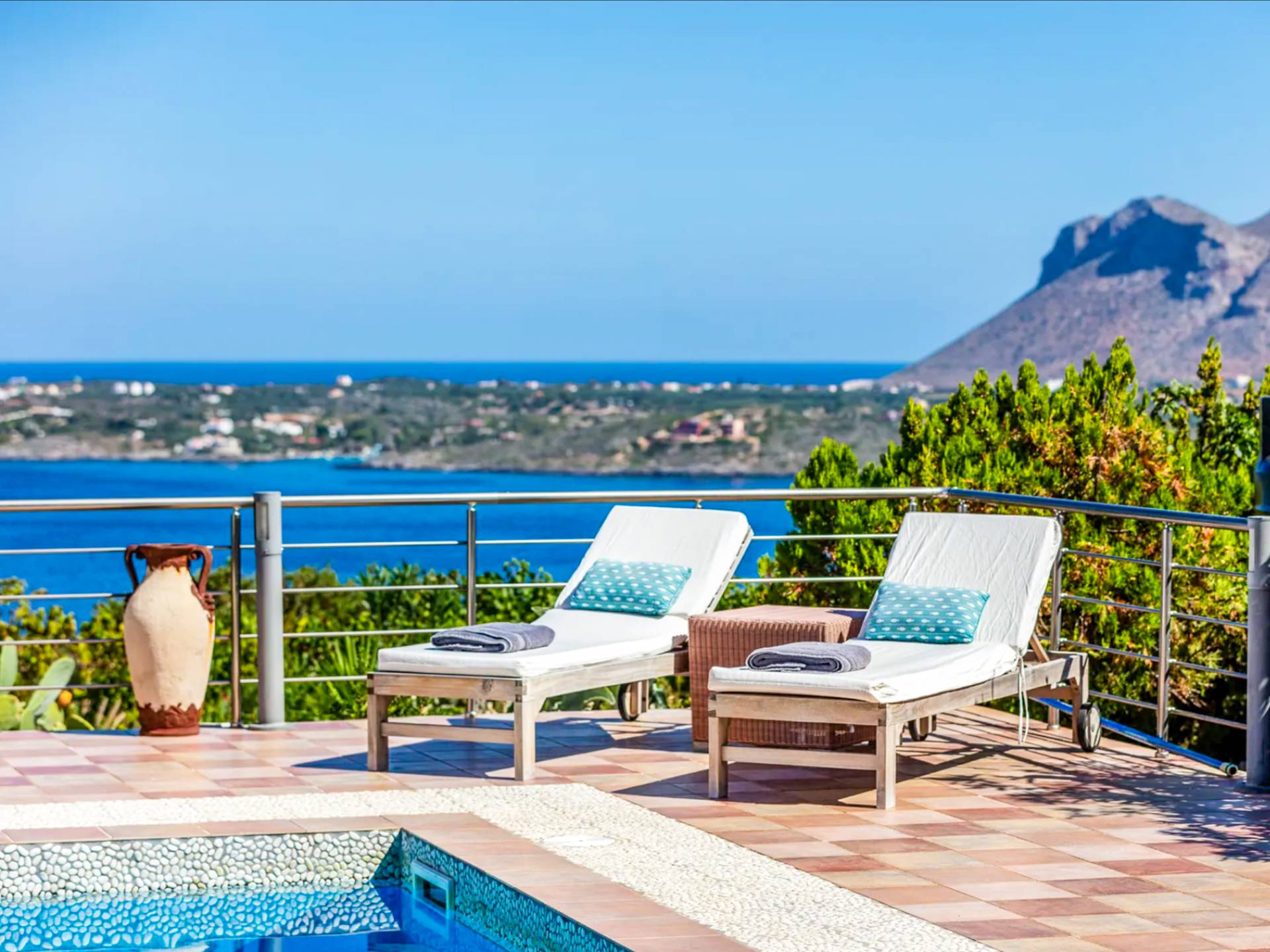 - Large balcony with furniture, sun loungers and panoramic sea view