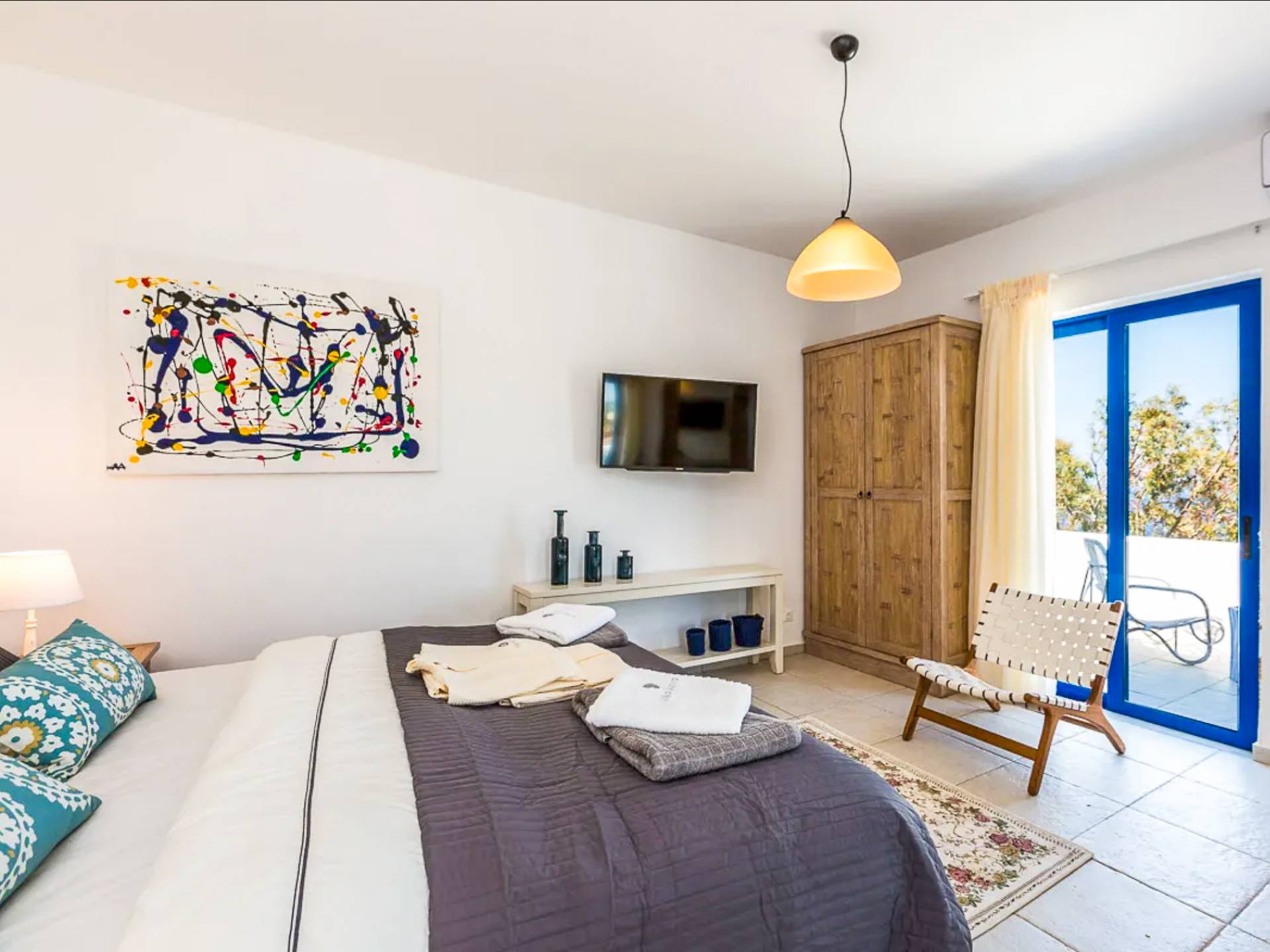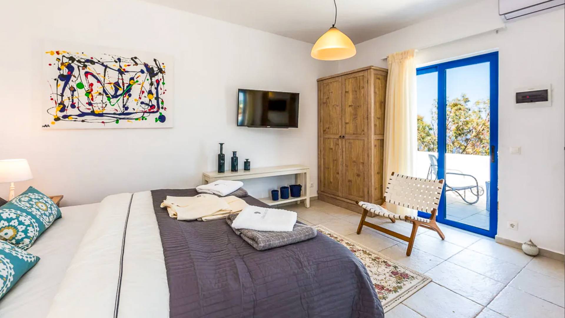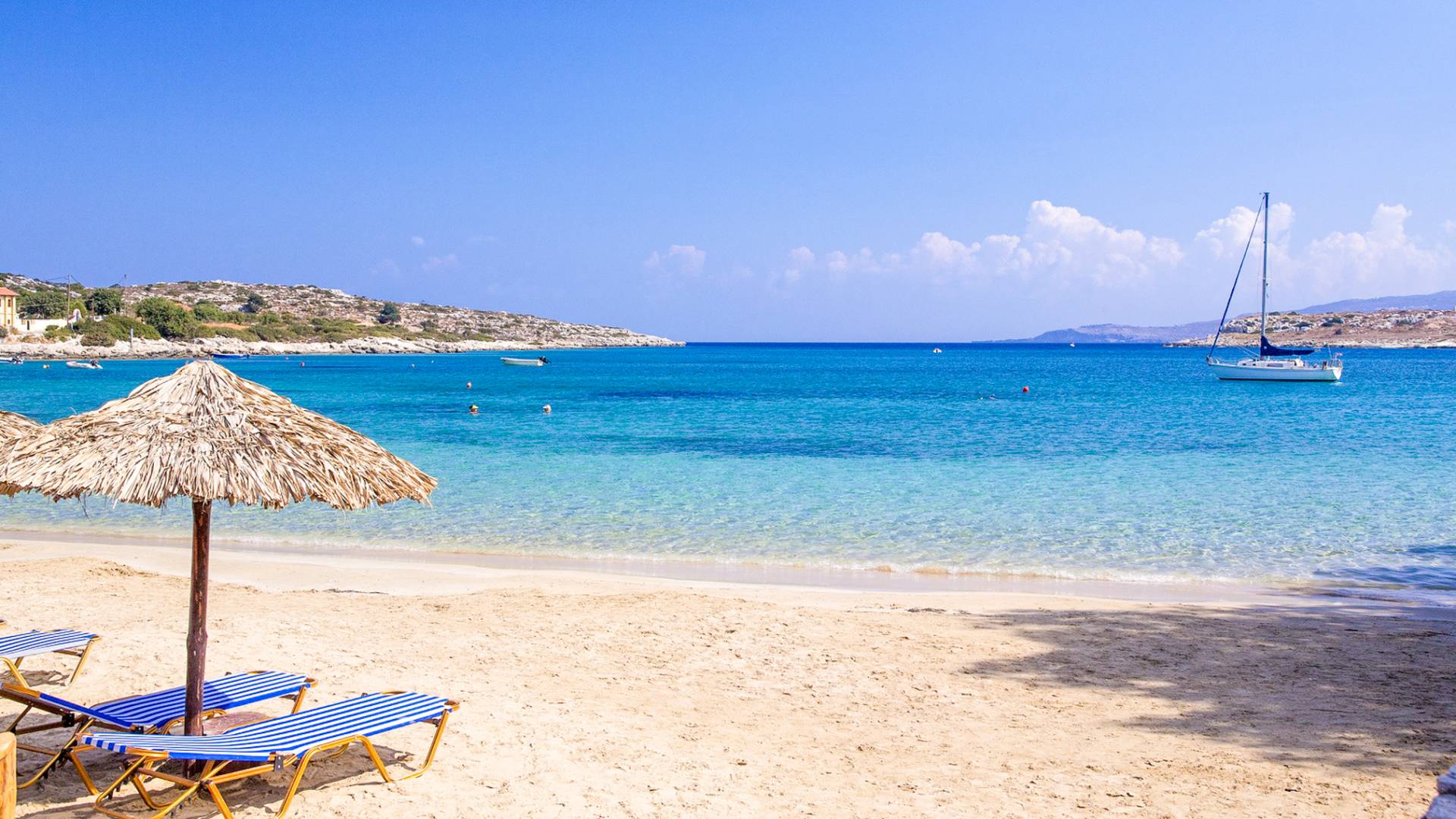 - Kalathas Beach: only a 3' minute drive (1,7 km) – sandy, family-friendly, with sunbeds and a beach bar.